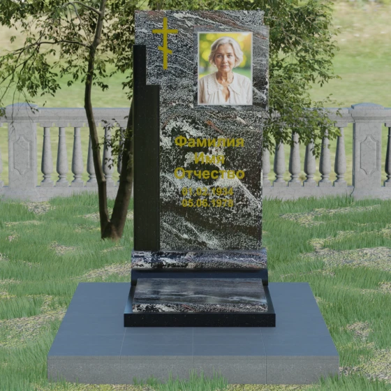 Основой мемориала является вертикальная стела, выполненная в контрастном сочетании двух видов камня, что придает памятнику объем и многогранность. В верхней части, по канонам веры, расположен восьмиконечный православный крест. Он выполнен в благородном золотом цвете, который мягко сияет на темном фоне, символизируя свет надежды и духовную чистоту. Справа от креста расположена уникальная деталь — интегрированная в основное полотно каменная рамка для портрета. Она выполнена из контрастного минерала с богатой зернистой текстурой, что создает визуальный акцент на образе дорогого человека, словно бережно обрамляя память о нем в вечный камень.