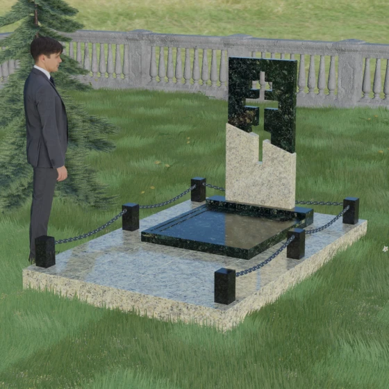 Особое внимание уделено комплексному благоустройству места захоронения. Скульптурная композиция установлена на массивный гранитный цоколь, который служит надежным фундаментом. Участок полностью закрыт сплошной надгробной плитой, выполненной в единой цветовой гамме со стелой. Такое решение не только придает мемориалу завершенный, монументальный вид, но и значительно упрощает уход за местом памяти: вам не придется бороться с сорняками или обновлять грунт. Периметр участка обозначен строгими каменными столбиками, соединенными декоративными цепями, что создает атмосферу защищенности и уединения, отделяя священное место от остального мира.