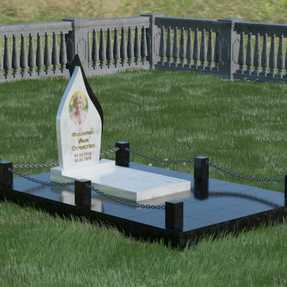 Особое внимание уделено благоустройству прилегающей территории. Мемориальная композиция включает в себя полное мощение участка массивными плитами из натурального камня. Это не только придает захоронению законченный и величественный вид, но и является практичным решением, избавляющим от необходимости постоянной борьбы с сорняками или проседания грунта. Периметр участка обозначен аккуратными каменными столбиками, соединенными декоративными цепями. Такая ограда создает визуальную и сакральную границу, защищая покой усопшего и подчеркивая обособленность места памяти. Каждый элемент — от полированных фасок на цоколе до золотистой гравировки имен — выполнен с ювелирной точностью.