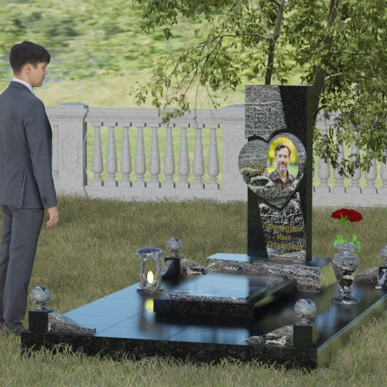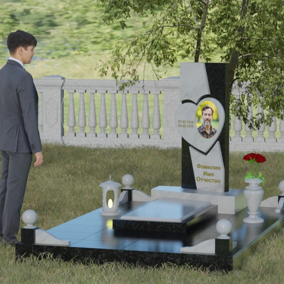 Кому подойдет: Данная модель является универсальной, однако за счет центрального символа — сердца — чаще всего выбирается для оформления женских захоронений. Она станет достойным выражением любви и вечной памяти для матери, супруги, дочери или сестры. Сложная геометрия и наличие декоративных элементов (вазы, шаров) делают это ритуальное изделие идеальным выбором для тех, кто ищет современный, эстетически насыщенный мемориал, сочетающий в себе европейский стиль и традиционную прочность натурального камня.
