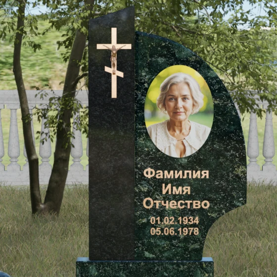 Оформление и советы искусствоведа: Для данной модели идеально подходит гравировка портрета в овальном или круглом формате, размещенная в верхней части «волнообразной» стелы. Это уравновешивает массивность левой части с крестом. Текст (ФИО и даты) рекомендуется выполнять глубоким академическим шрифтом с последующим покрытием сусальным золотом или «под бронзу», чтобы поддержать цветовую гамму распятия. Зеркальная полировка камня обеспечит четкость гравировки, которая не потускнеет и через сто лет, требуя лишь минимального ухода — протирки мягкой ветошью.