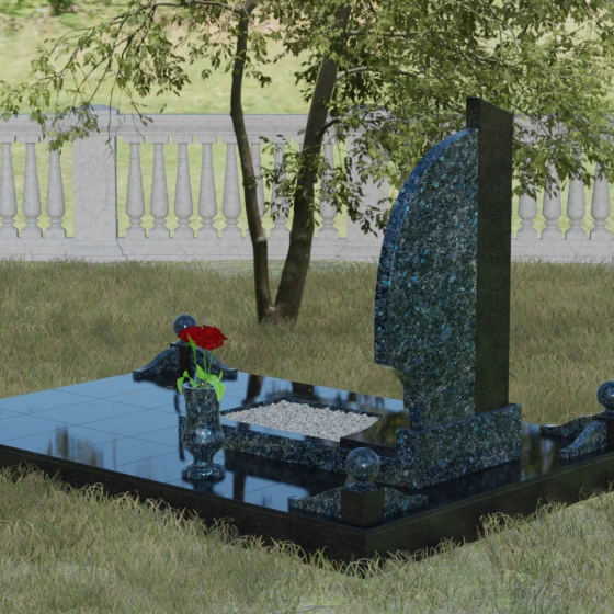 Правая часть композиции выполнена в форме изящного «крыла» или плавной волны, чьи округлые грани смягчают монументальность камня. Такая форма традиционно ассоциируется с нежностью, душевным теплом и вечной памятью о близком человеке. Особое внимание уделено фактуре: идеально гладкая, зеркальная полировка лицевых поверхностей создает глубокие отражения, в которых играет свет, визуально «оживляя» тяжелый гранит. Кромки и фаски обработаны с ювелирной точностью, подчеркивая премиальный статус изделия. Благоустройство участка продумано до мелочей: стела установлена на массивный гранитный постамент, который фланкируют декоративные каменные шары, придающие захоронению архитектурную завершенность. В едином ансамбле с памятником предусмотрена изящная ваза, предназначенная для живых цветов, что подчеркивает непрерывную связь между миром живых и миром ушедших.