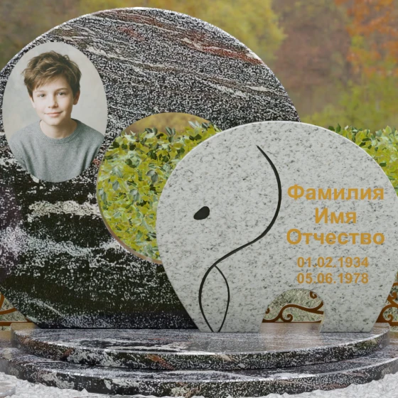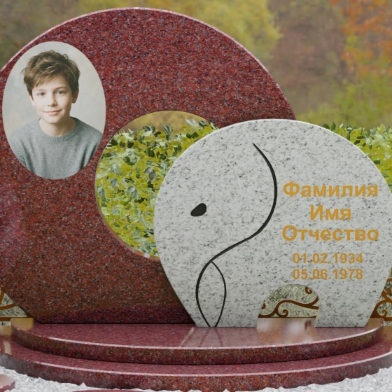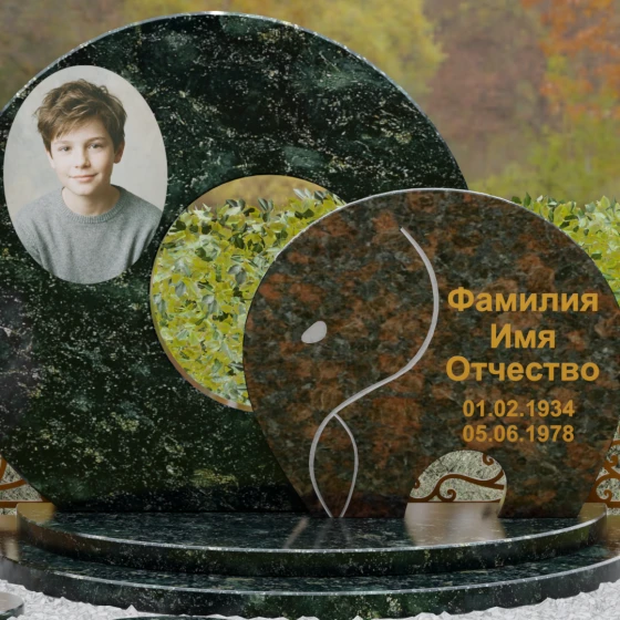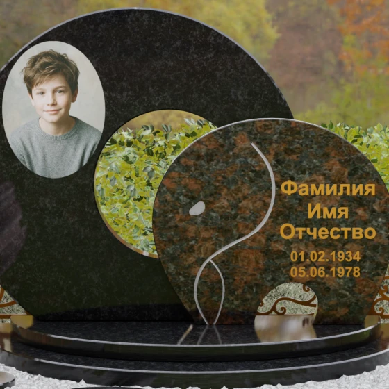Оформление и художественные советы: Для данной формы идеально подходит классическое размещение портрета на левой стороне основного диска — это может быть как фотокерамика, так и гравировка. ФИО и даты жизни рекомендуются к нанесению на передний контрастный элемент. Использование сусального золота или бронзовой краски в оформлении букв идеально подчеркнет теплоту натурального камня, особенно если вы выберете сочетание темного Габбро и цветного гранита. Плавные линии стелы диктуют выбор мягких, округлых шрифтов, которые подчеркнут общую эстетику композиции.