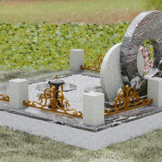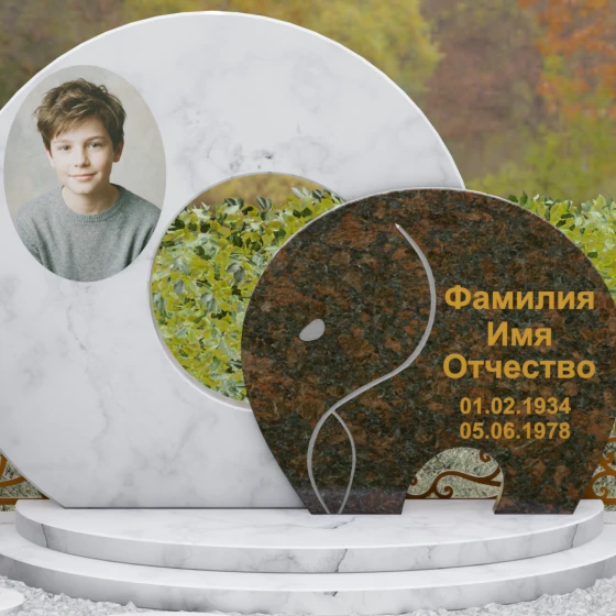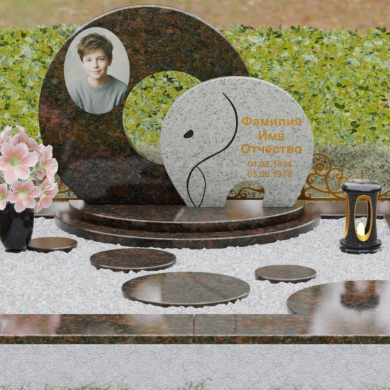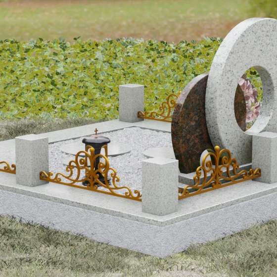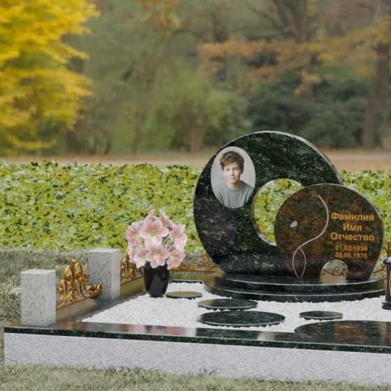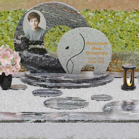 Данная мемориальная композиция (Артикул 134) представляет собой подлинный триумф архитектурной мысли, воплощенный в камне. В центре ансамбля находится величественная стела, состоящая из двух идеально выверенных дисков, которые словно накладываются друг на друга, создавая глубокий символизм бесконечности и цикличности бытия. Геометрия модели лишена острых углов: плавные, скругленные линии подчеркивают гармонию и умиротворение. Основной диск имеет сквозное круглое отверстие, что придает конструкции визуальную легкость и многогранность, в то время как передний сегмент из контрастного камня украшен изящной, лаконичной резьбой. Тонкая, едва уловимая линия художественной гравировки на фронтальной части напоминает стилизованный росток или абстрактный силуэт, подчеркивая индивидуальность мемориала. Массивная конструкция установлена на многоступенчатый круглый подиум, который возвышает монумент над землей, создавая эффект торжественности и непоколебимой надежности.