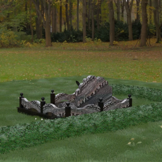 Данная мемориальная композиция представляет собой величественный ансамбль, в котором строгость камня смягчается плавностью природных линий. Выбор горизонтальной формы стелы продиктован стремлением создать ощущение покоя, стабильности и масштабности. Главным акцентом изваяния служит искусно выполненный силуэт истребителя, который словно устремляется ввысь на фоне резного навершия, напоминающего кучевые облака. Эта деталь превращает надгробие в персональный трибьют человеку, чья жизнь была неразрывно связана с небом, высотой и долгом перед Отечеством. Плавная волна верхнего края стелы гармонично перекликается с формой ограждения, создавая единое визуальное пространство, наполненное глубоким смыслом и уважением к памяти ушедшего.