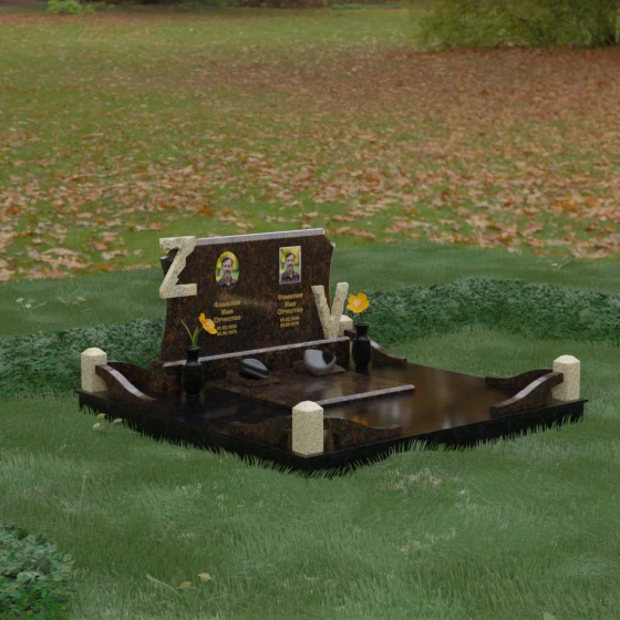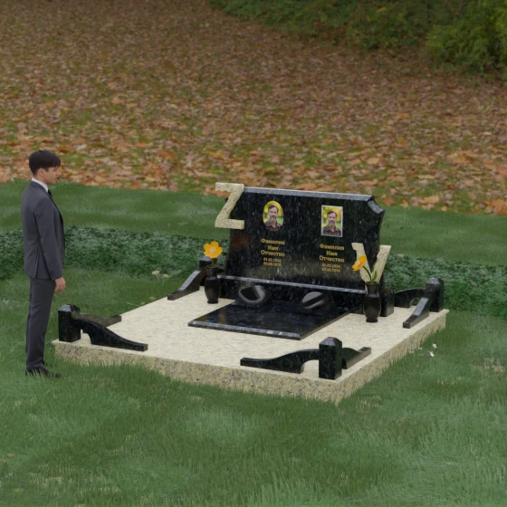 Данная мемориальная композиция включает в себя полное благоустройство участка, что избавляет от необходимости дополнительного оформления. Основанием служит высокий гранитный цоколь, обеспечивающий устойчивость и долговечность всей конструкции. Территория полностью закрыта монолитными надгробными плитами с зеркальной полировкой — это не только придает захоронению величественный вид, но и значительно упрощает уход, предотвращая рост сорной травы и скопление влаги.