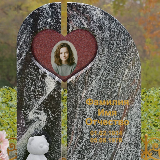 Особое внимание в данной модели уделено интеграции портрета. Ниша в форме сердца, расположенная в левой части композиции, является идеальным обрамлением для керамического фото или гравировки. Такое расположение акцентирует внимание на образе близкого человека, защищая его визуально «внутри» камня. Правая часть обелиска предназначена для лаконичного нанесения имени и дат, которые могут быть выполнены сусальным золотом или глубокой пескоструйной гравировкой, что идеально контрастирует с полированной поверхностью.