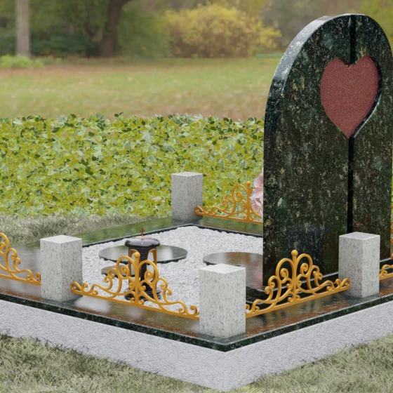 Данный гранитный монумент представляет собой сложную архитектурную композицию, где классические каноны мемориального искусства встречаются с современным европейским стилем. Выбор этой модели обусловлен её глубоким символизмом: центральный элемент выполнен в виде асимметричного полотна с изящным вырезом в форме сердца. Этот художественный прием превращает холодный камень в осязаемое воплощение любви и непреходящей скорби. Плавный изгиб верхней грани и вертикальное разделение основной плиты создают динамичный, но при этом умиротворенный силуэт, который гармонично доминирует над пространством захоронения.