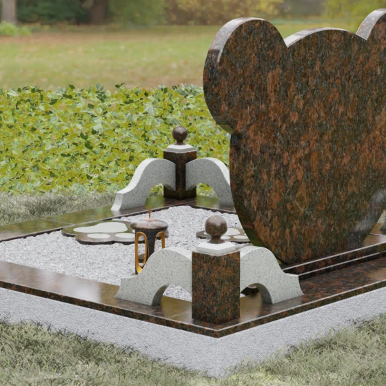 Эта мемориальная композиция представляет собой уникальный художественный проект, созданный для того, чтобы выразить бесконечную нежность и светлую печаль. Главная стела выполнена в форме головы медвежонка — символа чистоты, детства и вечного сна. Плавные, округлые линии силуэта лишены острых углов, что придает изделию визуальную мягкость и умиротворение. Мастера-камнерезы виртуозно передали геометрию образа: симметричные ушки со светлыми вставками и выразительные круглые глаза, созданные методом инкрустации камня другого оттенка. Игра контрастов между глубоким темным основанием и светлым матовым срезом декоративных элементов создает эффект живого объема, заставляя свет играть на полированных гранях и подчеркивая безупречную пластику камня.