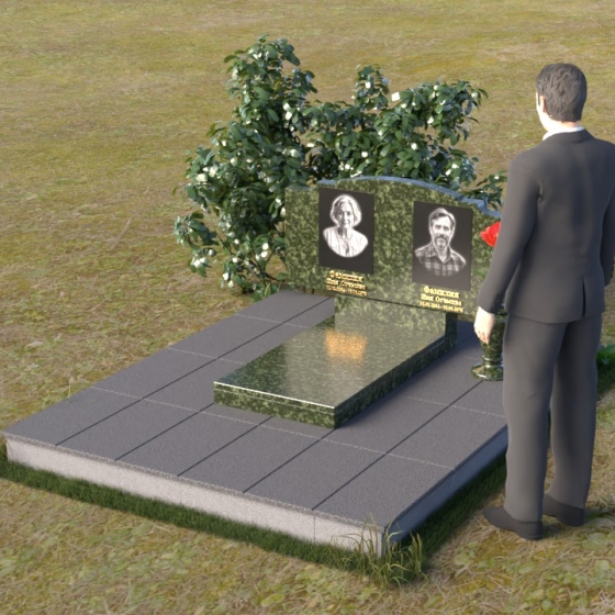 Этот гранитный монумент представляет собой композицию, где каждая деталь продумана до мелочей. Верхняя часть памятника имеет фигурную форму с плавными, волнообразными очертаниями, словно застывшая мелодия скорби. Верхний край обработан таким образом, что создает впечатление легкой, воздушной драпировки. Боковые грани аккуратно скруглены, смягчая строгость камня и придавая ему более изящный вид. Фаски, снятые по периметру, подчеркивают контур и добавляют выразительности. Лицевая поверхность отполирована до зеркального блеска, отражая свет и создавая ощущение глубины. На полированной поверхности выгравированы портреты усопших и памятные надписи, выполненные с особой тщательностью и вниманием к деталям. Под основной плитой располагается горизонтальная плита, также выполненная из черного гранита, создающая дополнительный уровень и подчеркивающая монументальность композиции. На ней размещена еще одна полированная плита, но уже меньшего размера, как символ нерушимости и продолжения рода.