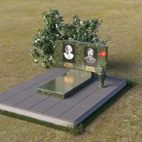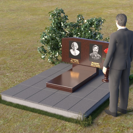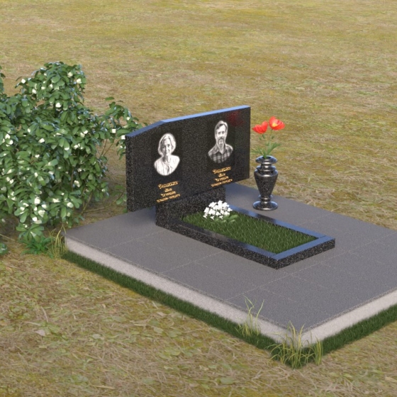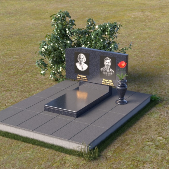 Основным элементом композиции является вертикальная плита, возвышающаяся над прямоугольным основанием. Гранитная плита имеет слегка вогнутую форму верхней грани, что придает ей мягкость и визуально облегчает массивность. На отполированной до зеркального блеска поверхности выгравированы портреты усопших, выполненные с высокой степенью детализации. Под портретами располагаются надписи с именами и датами жизни, выполненные строгим шрифтом. Вся композиция пронизана чувством сдержанности и достоинства, что позволяет сосредоточиться на главном – на памяти о тех, кого больше нет рядом.