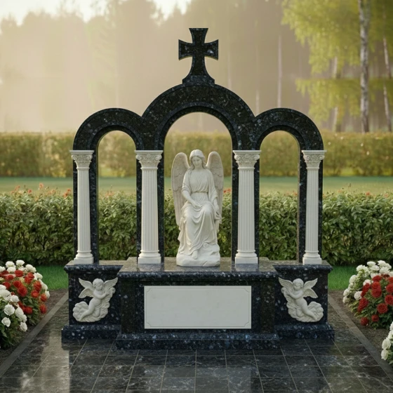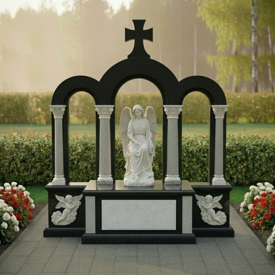 В основании композиции расположены две изящные барельефные скульптуры ангелов, выполненные из светлого камня и гармонично вписанные в боковые части цоколя. Эти ангелы, словно хранители, несут на себе символическую функцию защиты и оберега. Их мягкие формы и плавные линии контрастируют с строгой геометрией основной конструкции, добавляя ей нежности и утонченности. Фактура камня на этих элементах матовая, что создает игру контрастов с зеркальной полировкой гранита, подчеркивая объем и рельефность резьбы.