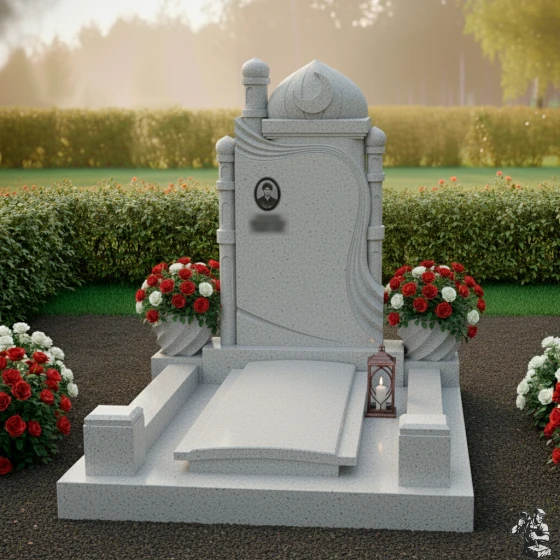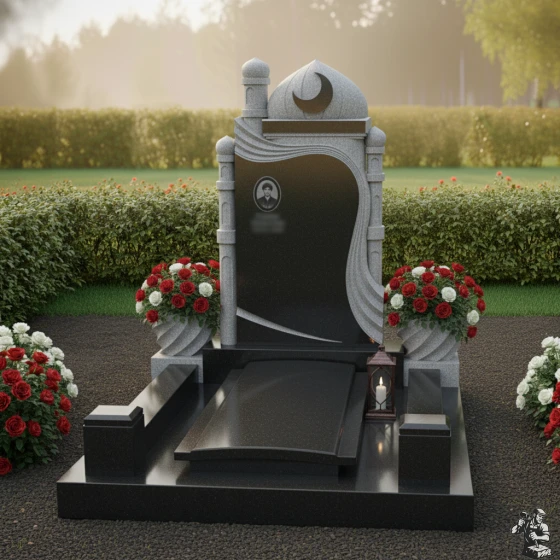 Модель ПН 088 — это не просто мемориальная плита, а подлинное произведение искусства, воплощающее в себе глубокую символику и эстетику восточной архитектуры. Центральная стела, выполненная в глубоком черном цвете, словно портал в мир воспоминаний, обрамлена изящными резными элементами. Ее форма напоминает величественную арку, увенчанную куполом мечети и полумесяцем со звездой — древними символами веры и духовности. Эти элементы выполнены с потрясающей детализацией: каждый изгиб купола, каждая грань минарета, каждый луч звезды проработан до совершенства, создавая ощущение легкости и воздушности, несмотря на монолитность камня. Изящная драпировка, струящаяся по бокам стелы, придает композиции динамичность и мягкость, символизируя скорбь и умиротворение. Контраст между зеркальной полировкой основной черной плиты, на которой будет сиять портрет и имя, и деликатной, чуть шероховатой фактурой светлых резных элементов, создает глубокий визуальный эффект, подчеркивая монументальность и изысканность. Этот контраст играет на свету, меняя оттенки и глубину, что делает монумент живым и многогранным.