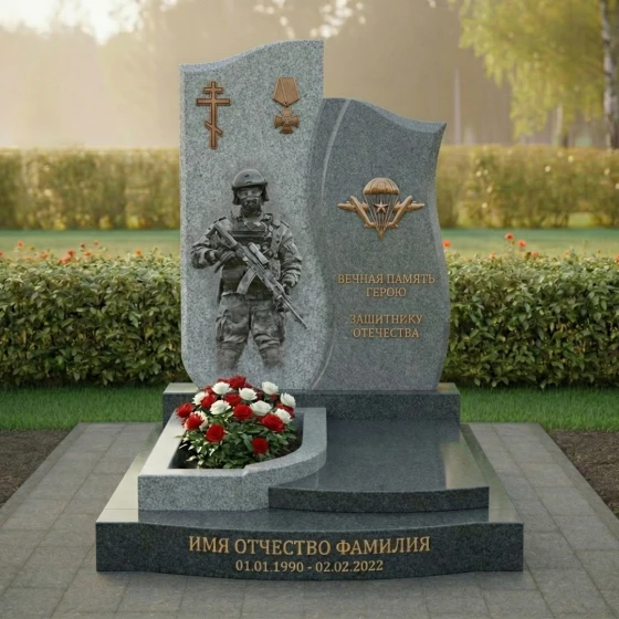 Правая стела, немного ниже и уже левой, имеет более динамичную, волнообразную форму. Ее верхняя часть плавно изгибается, создавая ощущение движения и легкости, несмотря на массивность камня. Лицевая сторона этой стелы также тщательно отполирована. В верхней части выгравирован символ Воздушно-десантных войск — парашют с крыльями, выполненный в золотистом цвете, что придает ему особую выразительность и значимость. Под ним располагаются проникновенные слова: "ВЕЧНАЯ ПАМЯТЬ ГЕРОЮ ЗАЩИТНИКУ ОТЕЧЕСТВА", выгравированные четким шрифтом, которые служат данью уважения и признательности. Боковые грани обеих стел имеют нежную, полуполированную обработку, которая мягко переходит в идеально отполированную лицевую часть, подчеркивая природную красоту камня и мастерство его обработки.