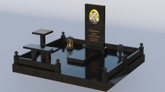 Благоустройство участка, на котором установлен памятник ПН 432, продумано до мелочей, создавая единый, законченный ансамбль. По периметру места захоронения возведен массивный гранитный цоколь, который не только придает всей конструкции устойчивость и монументальность, но и четко очерчивает границы участка, придавая ему ухоженный и благородный вид. Цоколь выполнен из того же черного гранита, что и стела, что создает ощущение единства и гармонии. Надгробная плита, полностью покрывающая площадь захоронения, также выполнена из полированного черного гранита. Это практичное и эстетичное решение, которое не только придает участку аккуратный и завершенный вид, но и значительно упрощает уход за местом памяти, избавляя от необходимости прополки и поддержания чистоты. По углам цоколя установлены изящные гранитные столбики, увенчанные сферическими навершиями, которые добавляют композиции торжественности и завершенности. В центре композиции, на надгробной плите, предусмотрено место для лампады, а рядом расположена элегантная гранитная ваза для цветов, выполненная в едином стиле с общим ансамблем. В ней уже стоит пышный букет из красных и белых роз, символизирующих любовь и чистоту, что придает месту покоя живое и трогательное украшение.
