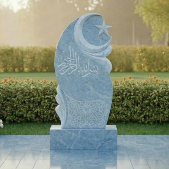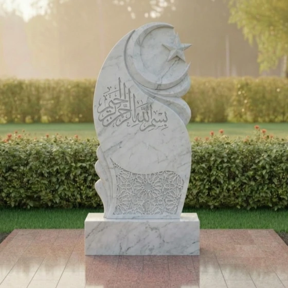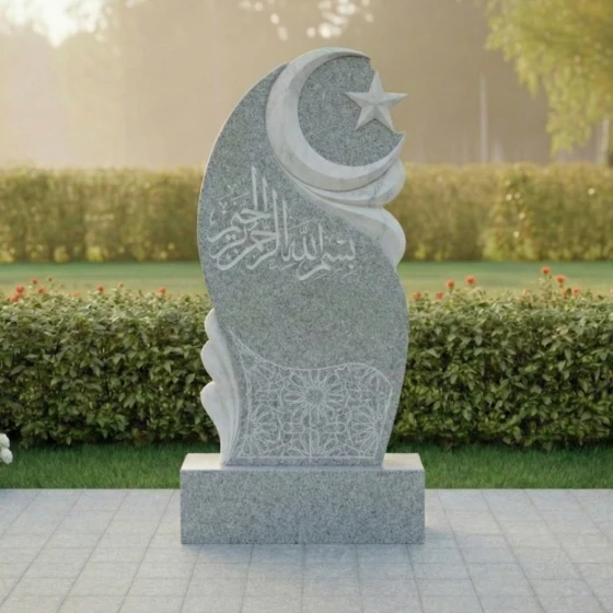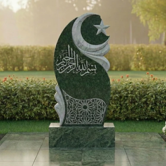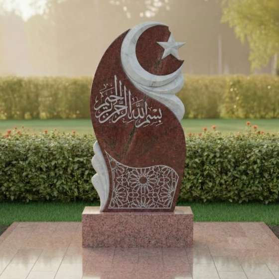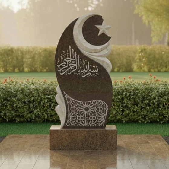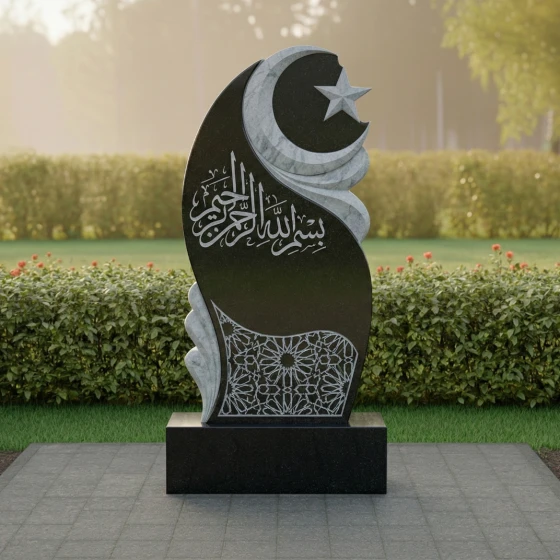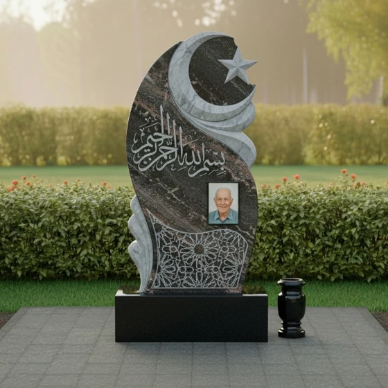 В верхней части стелы, на фоне этого волнообразного рельефа, высечены полумесяц и пятиконечная звезда – традиционные символы ислама, выполненные с особой тщательностью. Звезда имеет четкие, острые грани, а полумесяц плавно изогнут, придавая всей верхней части композиции выразительность и духовное значение. Ниже, в центральной части, расположена глубокая, изысканная гравировка арабской вязью, выполненная с ювелирной точностью. Каждая буква, каждый завиток этого священного текста проработан до мельчайших деталей, создавая эффект объемного рельефа на зеркальной поверхности камня. В нижней части стелы, на темном фоне, выгравирован сложный геометрический орнамент, напоминающий традиционные восточные узоры. Его тонкие линии и повторяющиеся элементы создают ощущение бесконечности и гармонии, добавляя композиции изысканности и завершенности.