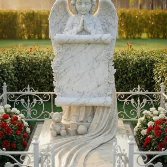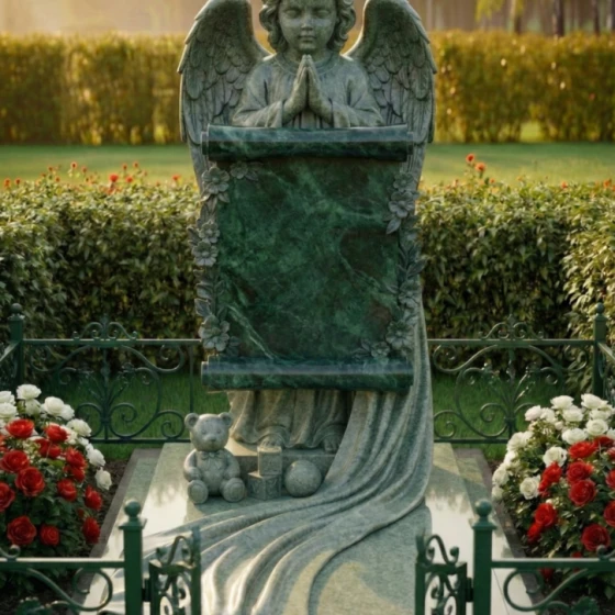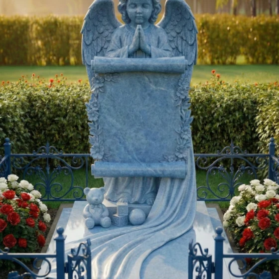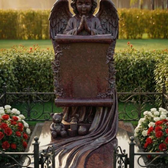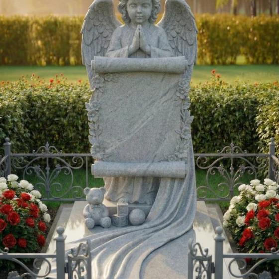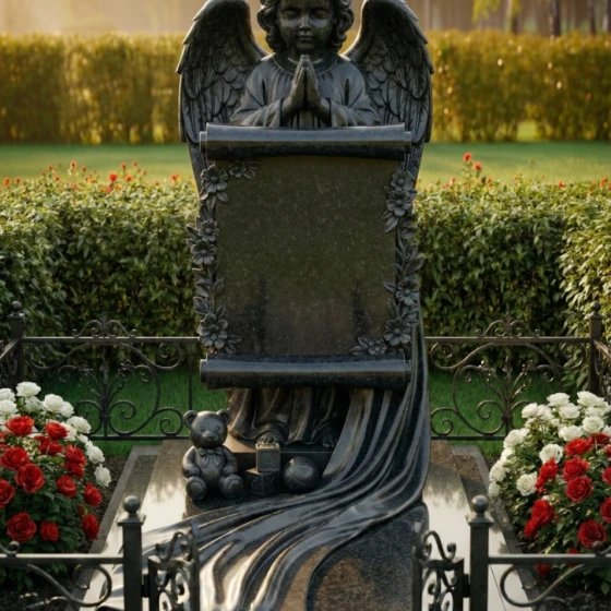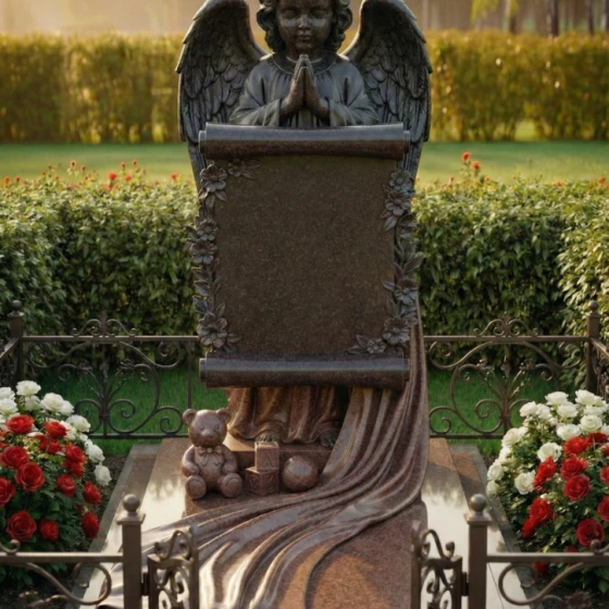 Каждая линия этого изделия наполнена глубоким смыслом. Образ ангела символизирует небесную защиту и надежду на встречу в лучшем мире, а развернутый свиток олицетворяет «Книгу Жизни», в которую навечно вписано имя дорогого человека. Растительный орнамент из цветов традиционно связывается с неувядающей чистотой души. Наличие детских игрушек у подножия указывает на чистоту и невинность, делая этот мемориал идеальным выбором для оформления захоронения ребенка или юной девушки, подчеркивая невосполнимость утраты и нежность чувств родных.