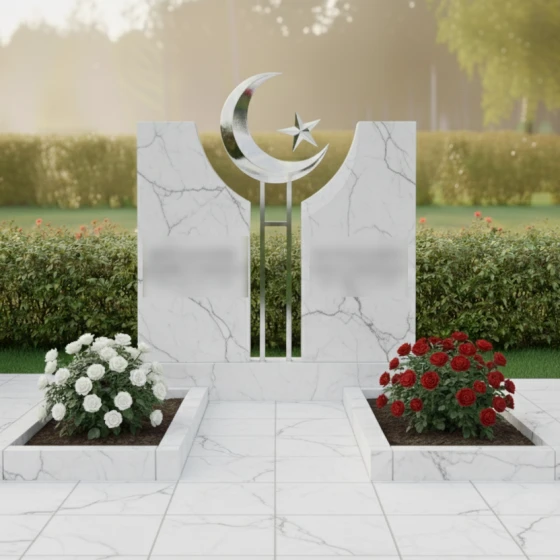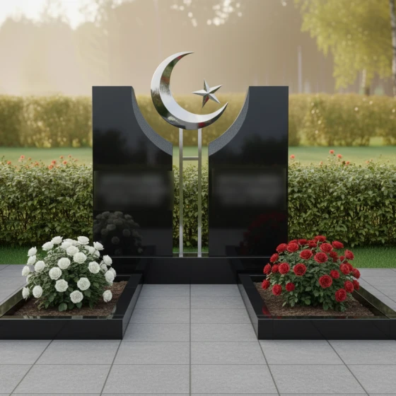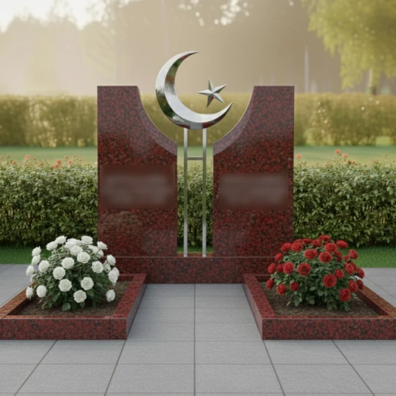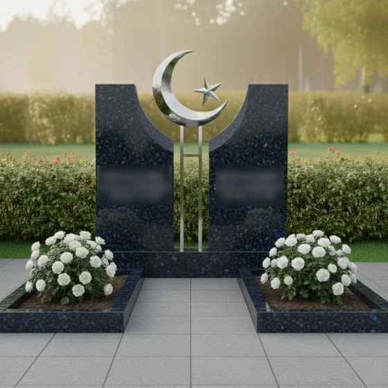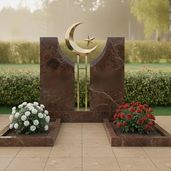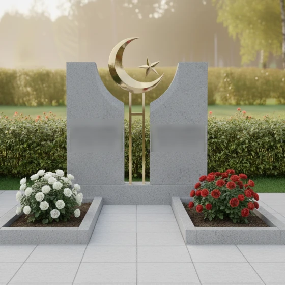 Данное ритуальное изделие представляет собой величественную парную композицию, воплощающую идею неразрывной духовной связи и вечного покоя. В центре художественного замысла находятся две вертикальные стелы, симметрично расположенные друг относительно друга. Их строгая геометрия смягчена изящными вогнутыми фасками во внутренней части: мастера-камнерезы ювелирно выбрали камень, создав идеальную полукруглую нишу. В этом пространстве, словно паря над землей, установлен главный символ веры — объемный полумесяц со звездой. Сочетание природного камня и металлического элемента подчеркивает статус захоронения и придает всей конструкции торжественный, одухотворенный вид.