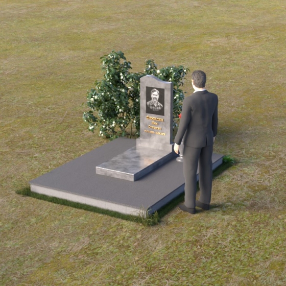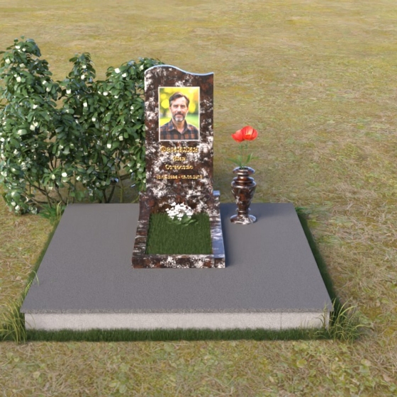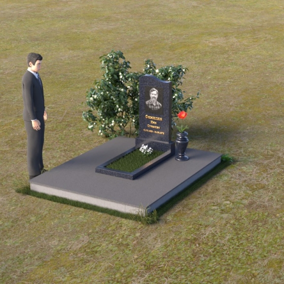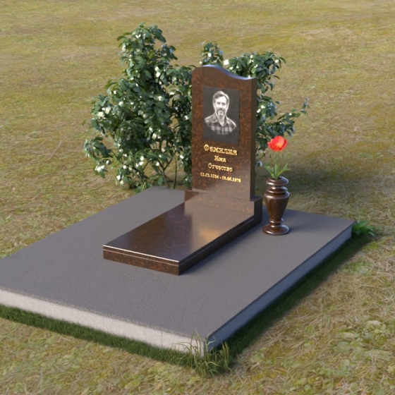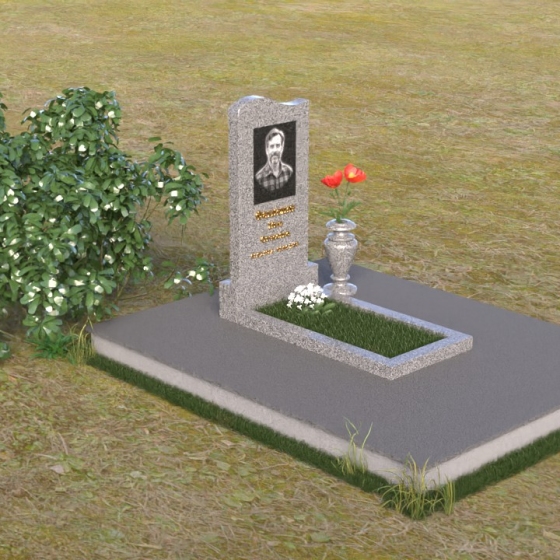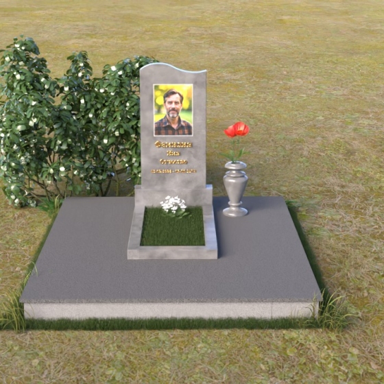 Представленная мемориальная композиция отличается лаконичностью и элегантностью. Ее строгие формы, смягченные плавными изгибами, символизируют как жизненный путь, так и обретение покоя. Верхняя часть стелы имеет мягкий, едва заметный изгиб, словно склоняясь в знак уважения. Грани стелы деликатно обработаны, что придает ей завершенный и благородный вид. На лицевой стороне выгравированы портрет усопшего и памятные надписи, выполненные с особой тщательностью.