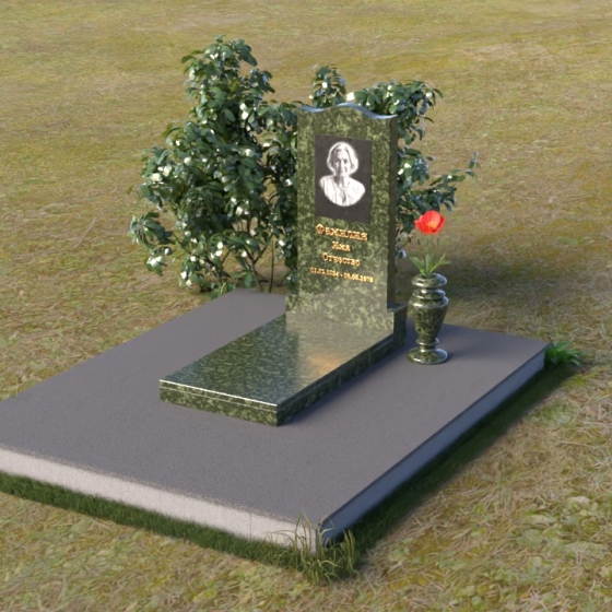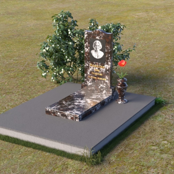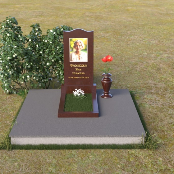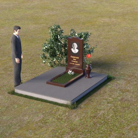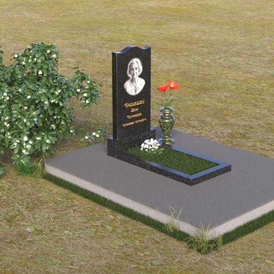 Величественная стела памятника ПВ 008 представляет собой элегантное сочетание строгих линий и плавных изгибов. Верхняя часть стелы имеет волнообразную форму, смягчающую строгость камня и придающую ей утонченность. Грани стелы тщательно отполированы до зеркального блеска, отражая свет и создавая ощущение легкости и воздушности. На лицевой стороне стелы размещен портрет усопшего, выполненный методом гравировки. Ниже располагаются надпись с именем и датами жизни. Под стелой расположена горизонтальная плита, также выполненная из полированного гранита. Ее строгие прямоугольные формы контрастируют с плавными линиями стелы, подчеркивая ее выразительность. Фаски по периметру плиты смягчают углы и придают ей завершенный вид. Рядом со стелой установлена небольшая ваза из темного гранита с изящным орнаментом, предназначенная для живых цветов.
