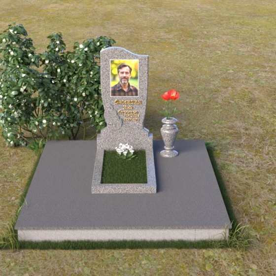 Величественная стела памятника ПВ 015 выполнена в строгой, но элегантной форме. Верхняя часть памятника имеет плавный, волнообразный силуэт, что придает ему мягкость и изящество. Сглаженные углы и отсутствие острых граней создают ощущение покоя и умиротворения. Боковые грани стелы слегка скошены, что визуально облегчает конструкцию и добавляет ей динамичности. Фаска, обрамляющая верхнюю часть памятника, подчеркивает его контур и придает завершенность образу. Нижняя часть стелы, переходящая в тумбу, имеет строгую прямоугольную форму, обеспечивая устойчивость и надежность всей конструкции. Зеркальная полировка поверхности камня отражает окружающий мир, создавая ощущение глубины и света. На стеле располагается портрет усопшего, выполненный с высокой точностью и детализацией, а также памятная надпись, нанесенная золотыми буквами.