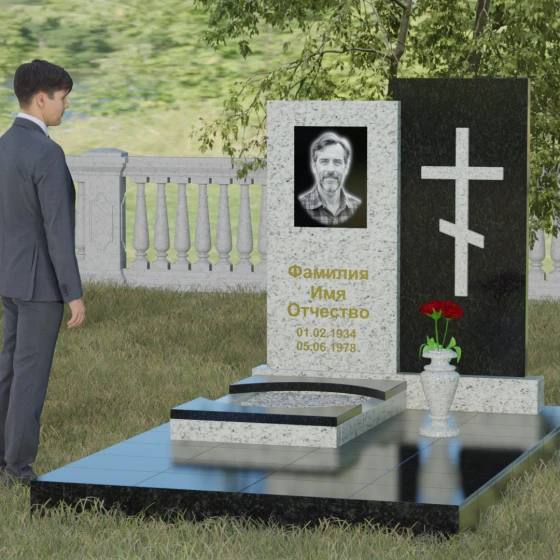 Данная модель представляет собой сложную двухкомпонентную конструкцию, построенную на гармонии противоположностей. Основной вертикальный элемент разделен на две части разного цвета и фактуры. Левая панель, выполненная из темного, глубокого камня, предназначена для центрального акцента — портрета и мемориальных надписей. Благодаря идеальной гладкости, гравировка здесь выглядит максимально четко, а портрет обретает фотографическую точность и одухотворенность. Правая часть композиции — это блок из светлого камня, на котором располагается лаконичный православный крест. Крест выполнен в строгом черном цвете, что создает мощный визуальный контраст на светлом фоне, подчеркивая духовную чистоту и значимость символа веры. Геометрия модели подчеркнуто строгая: прямые линии и четкие грани символизируют твердость характера и прямоту жизненного пути.