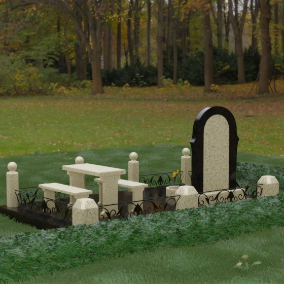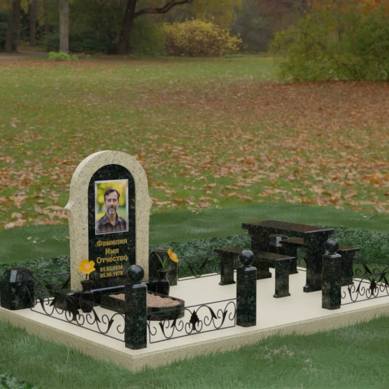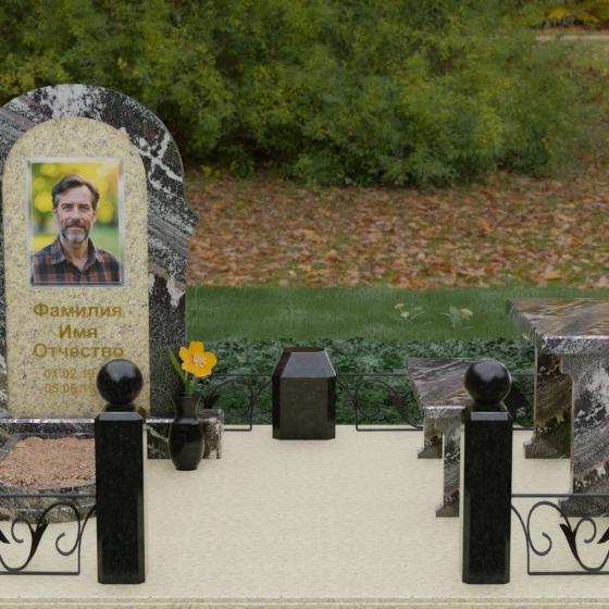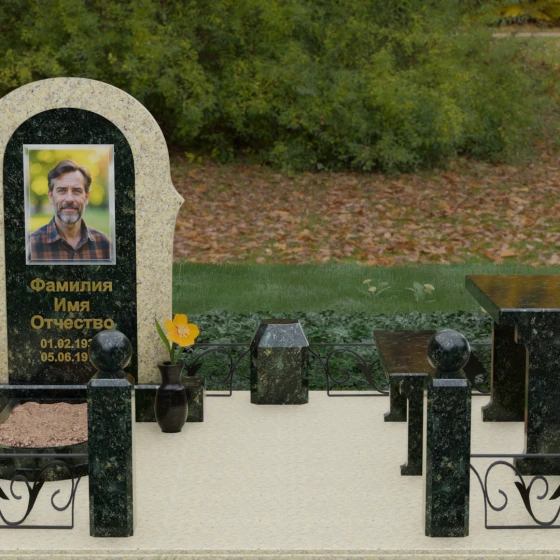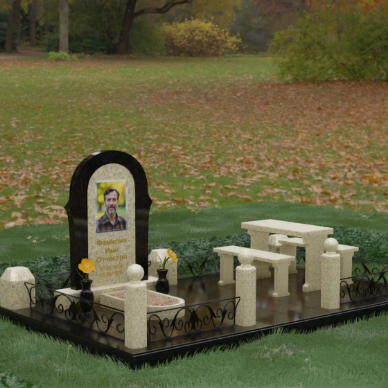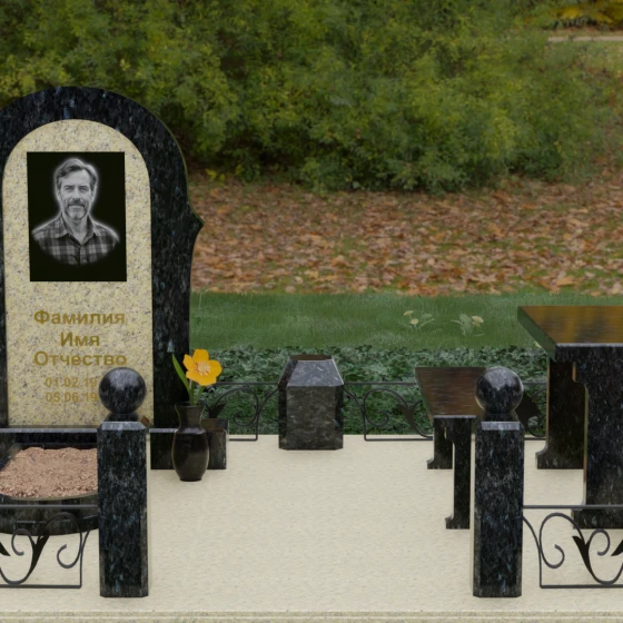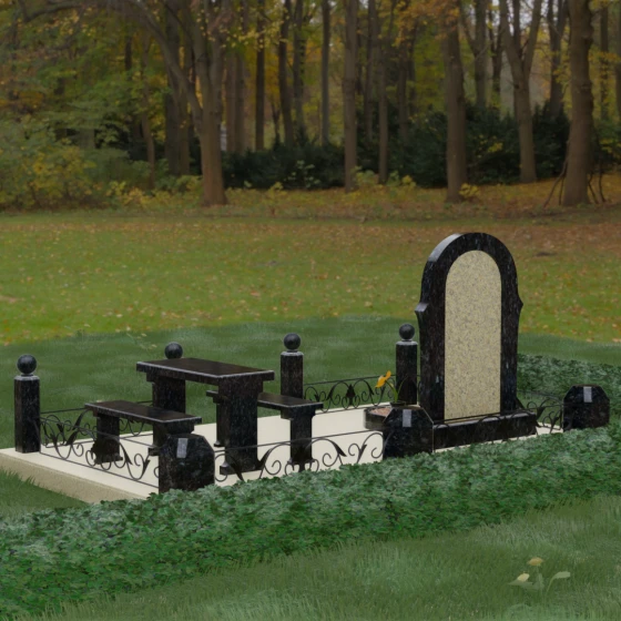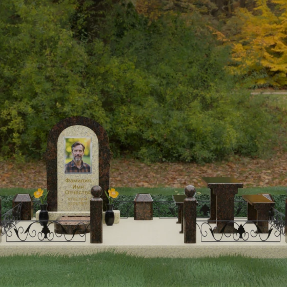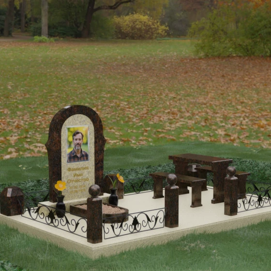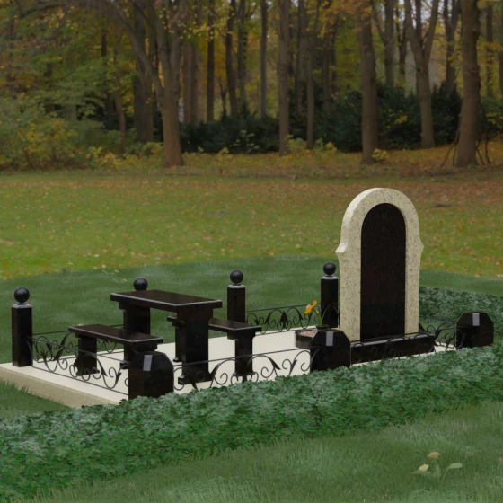 - Элементы благоустройства: Монолитный цоколь, каменное мощение, декоративные вазы, кованое ограждение с гранитными столбами, мемориальный стол и лавки.