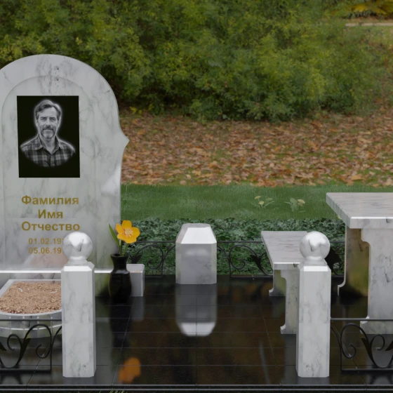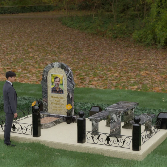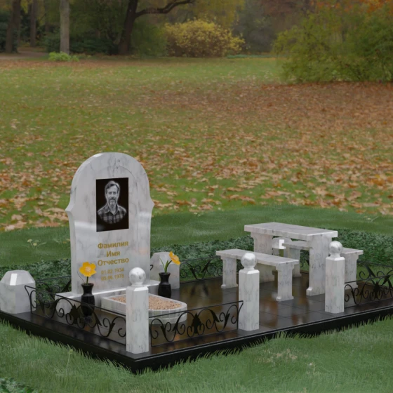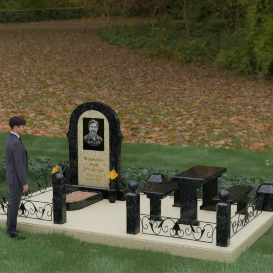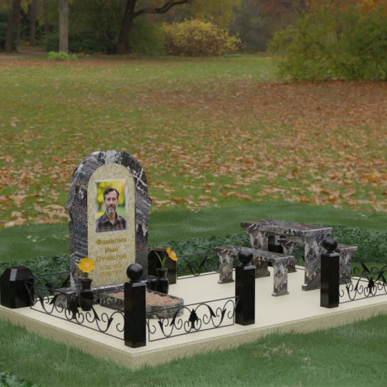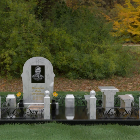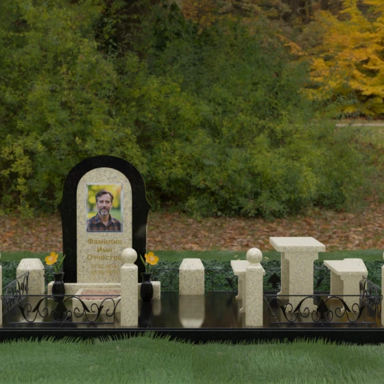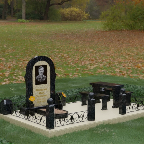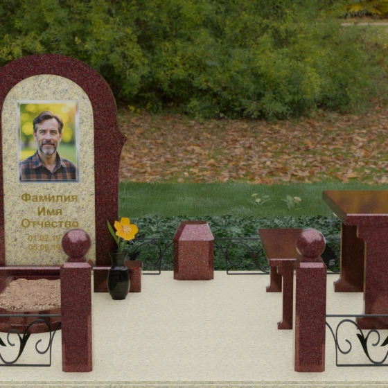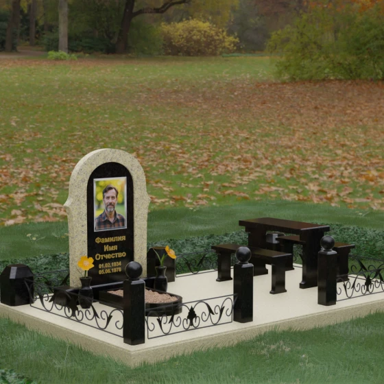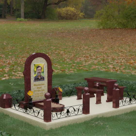 - Элементы благоустройства: Монолитный цоколь, каменное мощение, декоративные вазы, кованое ограждение с гранитными столбами, мемориальный стол и лавки.
