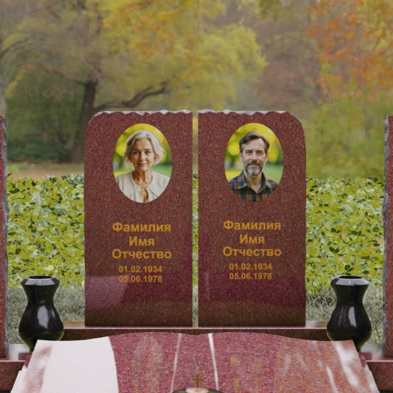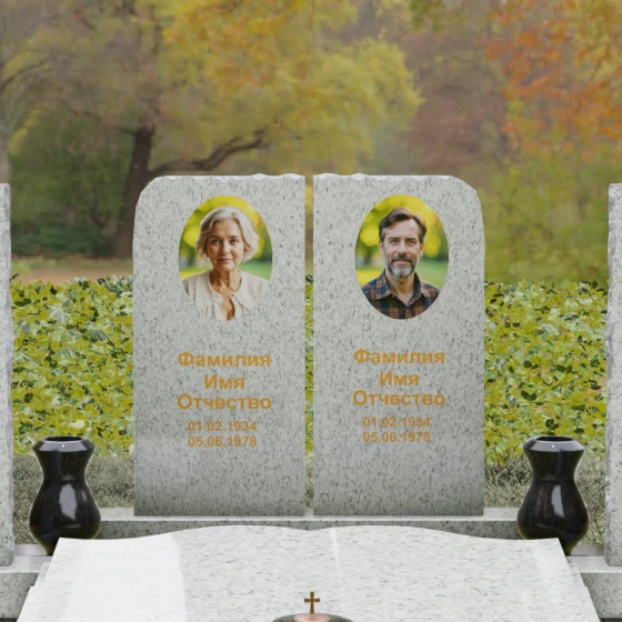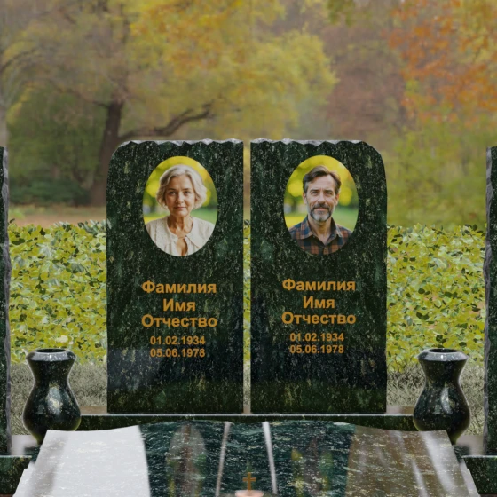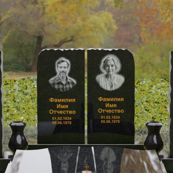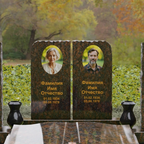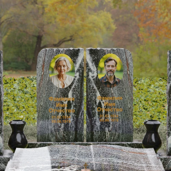 На широких полированных поверхностях одинаково выигрышно смотрятся как классическая лазерная гравировка портретов, так и цветные керамические медальоны. На представленных образцах мы видим золочение знаков — этот метод идеально сочетается с темными породами камня, делая надписи читаемыми даже в пасмурную погоду и придавая мемориалу торжественный вид. Размещение портретов в верхней трети стелы позволяет оставить достаточно места для эпитафий и декоративных элементов, таких как ветви деревьев или религиозные символы, выгравированные непосредственно на камне.