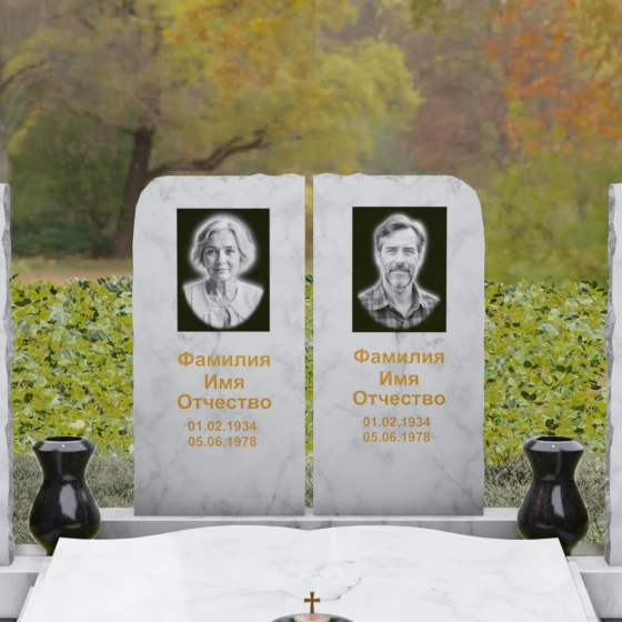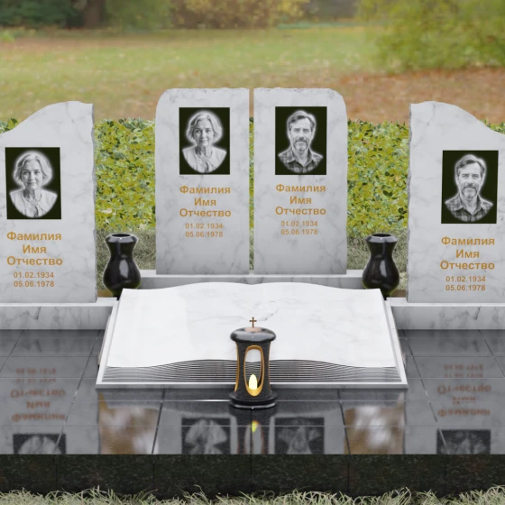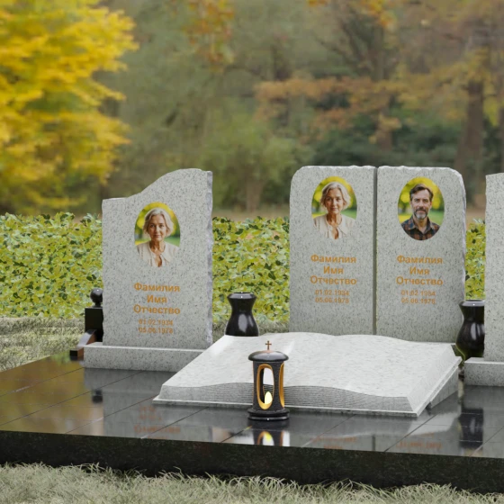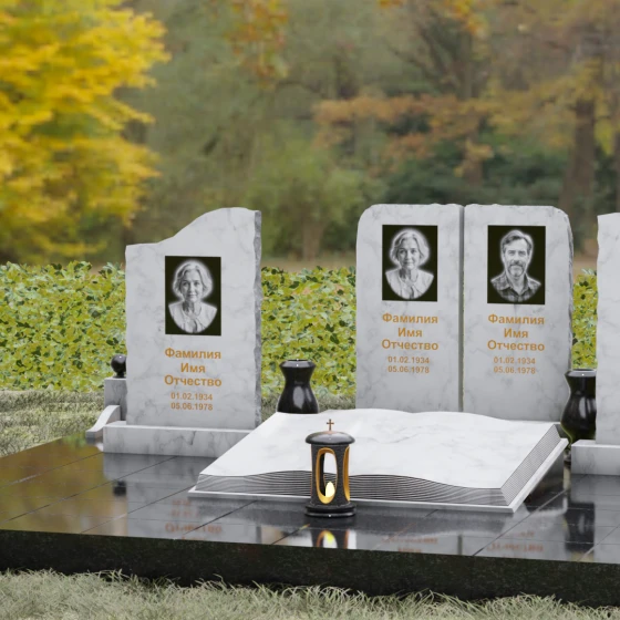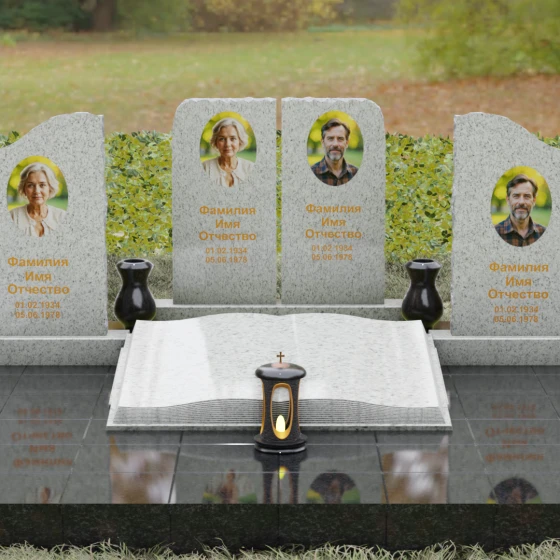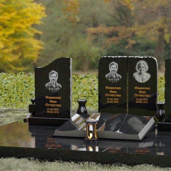 Геометрия комплекса продумана до мелочей: две центральные стелы имеют строгие прямоугольные формы, которые словно зеркалят друг друга, в то время как внешние плиты обладают мягкими, волнообразными изгибами верхнего края. Такое сочетание мужского и женского начал, строгости и плавности, позволяет увековечить память о нескольких поколениях семьи в рамках одного участка. Центральная горизонтальная плита, на которой расположен лаконичный православный крест, служит смысловым центром, объединяющим все элементы в неразрывную композицию.