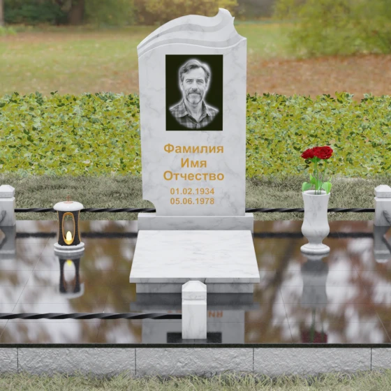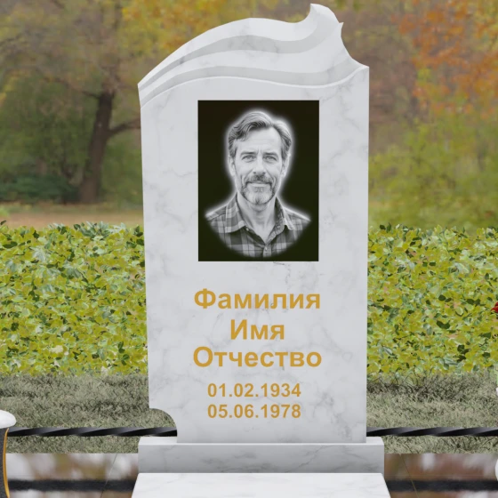Артикул 149 представляет собой сложную архитектурную форму, в которой заложена глубокая метафора «Книги жизни». Выбор данной модели — это стремление запечатлеть историю близкого человека в благородном материале. Верхняя часть стелы виртуозно исполнена в виде раскрытого фолианта или старинного свитка: мастерская резьба имитирует слоистые изгибы страниц, уходящих вглубь камня. Здесь мы видим великолепную игру контрастов, доступную только при профессиональной обработке камня. Фронтальная плоскость обладает безупречной зеркальной полировкой, в то время как резные элементы страниц выполнены в светлой, матовой фактуре, что придает монументу визуальную легкость и объем. Асимметричный силуэт с плавными волнами по верхнему краю избавляет конструкцию от излишней тяжести, создавая эстетичный и одухотворенный образ, который гармонично вписывается в ландшафт мемориального комплекса.