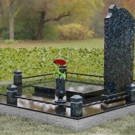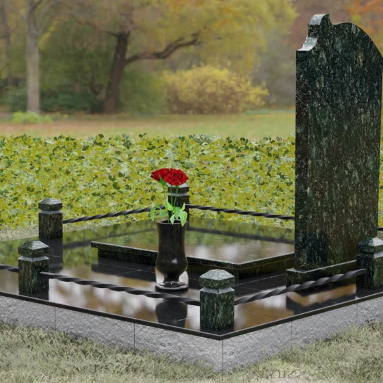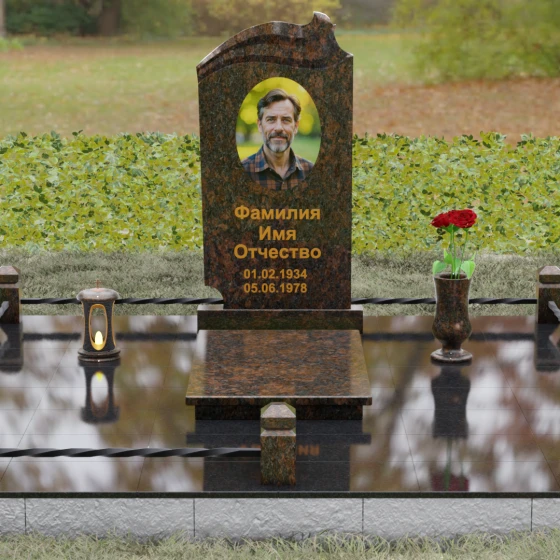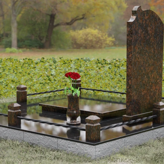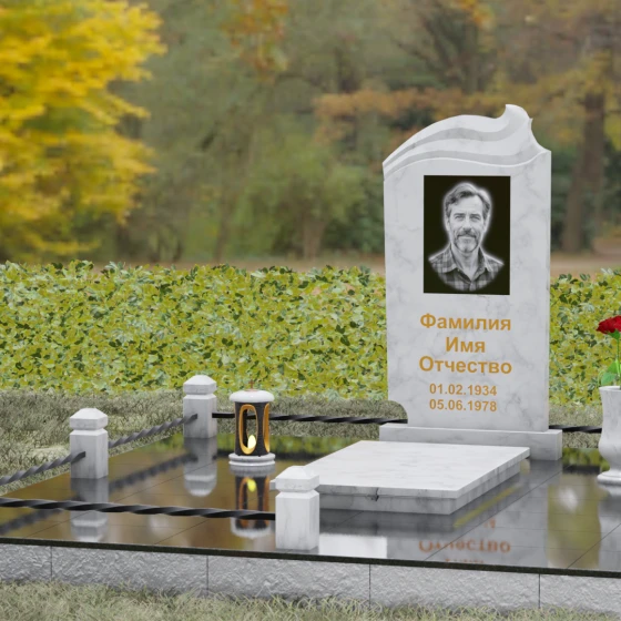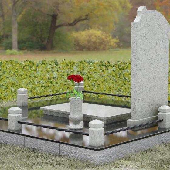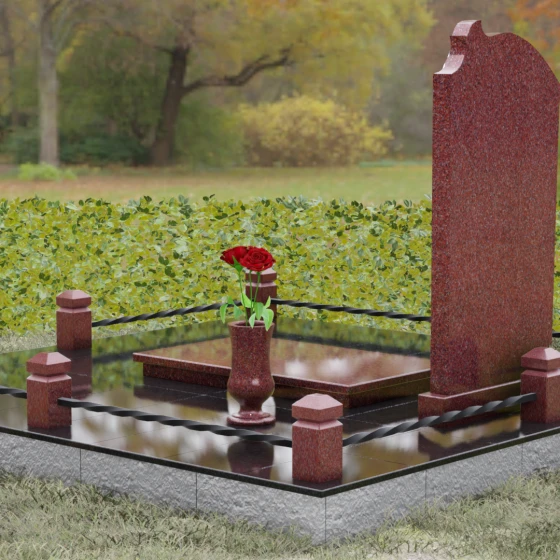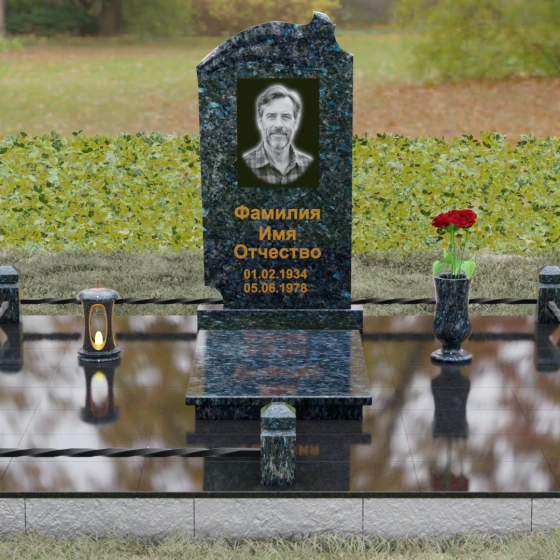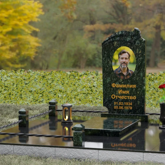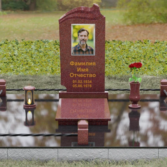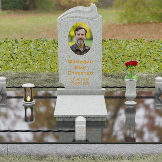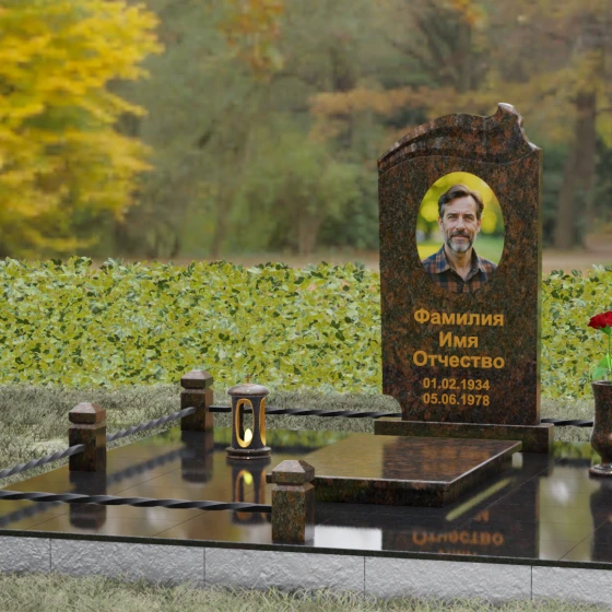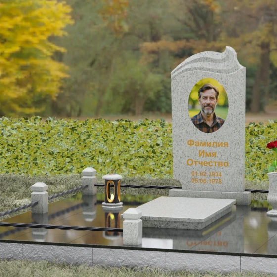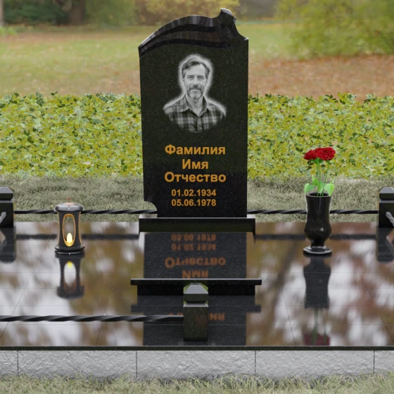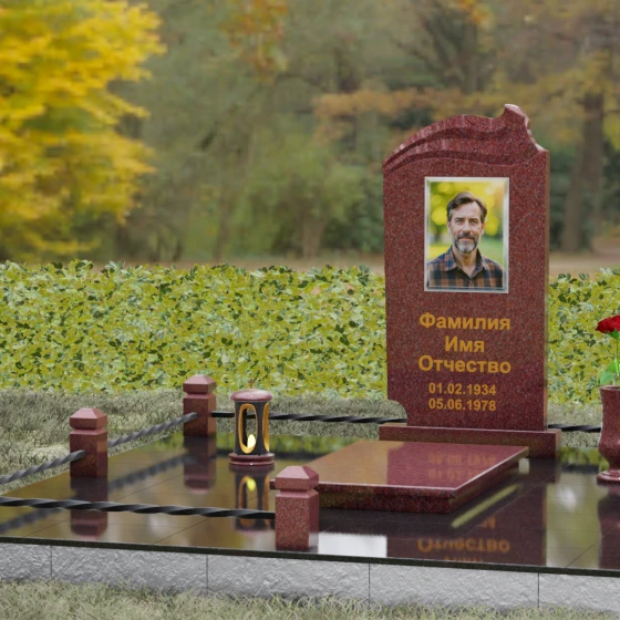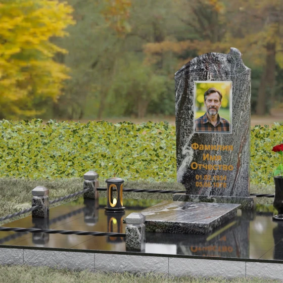 Композиция мемориала продумана до мелочей и включает в себя полное благоустройство участка. Стела устанавливается на прочный гранитный постамент, который является частью единого подиума. Вместо открытого грунта используется сплошное мощение участка массивными полированными плитами, что обеспечивает чистоту и законченный вид. Периметр захоронения оформлен низким гранитным цоколем с фигурными столбиками, грани которых повторяют фаски основной стелы. В ансамбль включены функциональные декоративные элементы: изящная каменная ваза для цветов и закрытая лампада, защищающая пламя памяти от ветра. Портрет, расположенный в центральной части под резным сводом, становится смысловым акцентом, а золоченая гравировка букв подчеркивает премиальный статус надгробия.