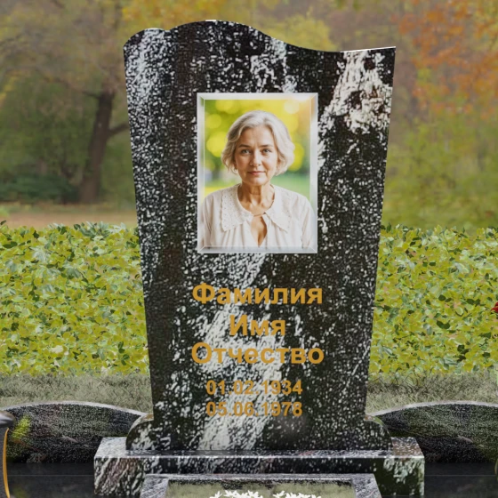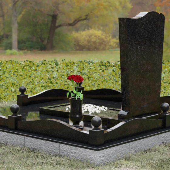 Стела этого ансамбля (Артикул 150) отличается изысканной асимметричной геометрией, которая выделяет её на фоне классических решений. Верхняя грань изделия выполнена в форме плавной, ниспадающей волны, напоминающей движение ткани или изгиб небесного свода. Этот мягкий рез по камню создает выразительный силуэт, который гармонирует с вертикальными боковыми гранями, слегка сужающимися к основанию. Особое внимание уделено фактуре: идеально гладкая зеркальная полировка лицевой поверхности контрастирует с четкими, мастерски обработанными фасками. Игра света на полированных гранях подчеркивает благородство природного материала, а глубина блеска создает эффект бесконечности, в которой отражается небо, соединяя земную память с вечностью.