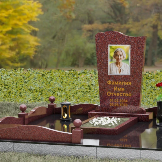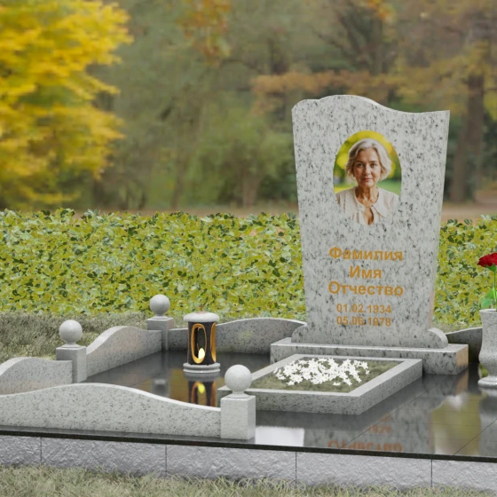 Благоустройство участка выполнено с учетом высших стандартов мемориальной архитектуры. Ритуальное изделие установлено на массивный гранитный цоколь, который служит надежным фундаментом и визуально приподнимает комплекс над уровнем земли. По периметру установлены строгие столбики, увенчанные идеально отполированными каменными шарами — классическим символом мироздания и завершенности пути. Внутренняя площадь полностью облицована гранитными плитами мощения, что исключает прорастание травы и гарантирует безупречный вид комплекса десятилетиями. Композицию завершают функциональные и эстетичные аксессуары: точеная гранитная ваза для живых цветов и закрытая лампада, выполненная в единой стилистике с основным надгробием.