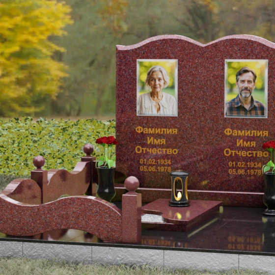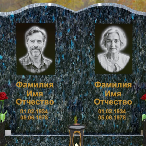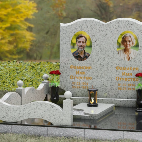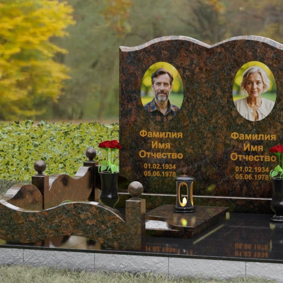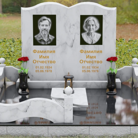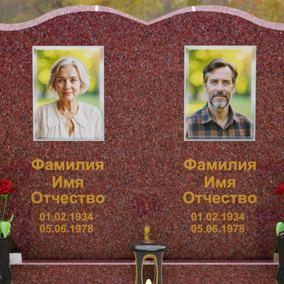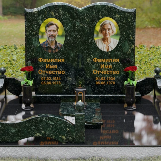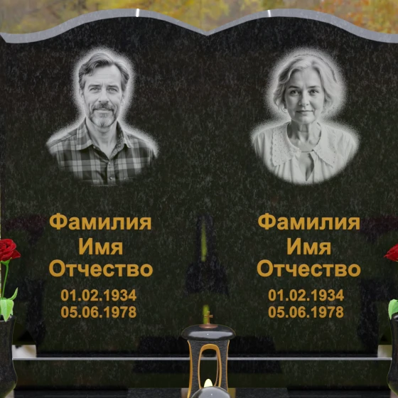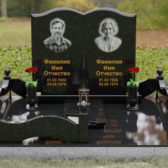 Оформление: Учитывая форму раскрытой книги, для этой модели идеально подходит гравировка ФИО и дат с покрытием сусальным золотом или краской «под бронзу». Это создает эффект старинного фолианта. Портреты могут быть выполнены как в технике лазерной гравировки с высокой детализацией (на темных сортах камня), так и в виде керамических овалов, врезанных в толщу гранита, что особенно эффектно смотрится на светлом мраморе Тассо или Мансуровском граните.