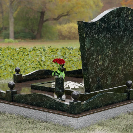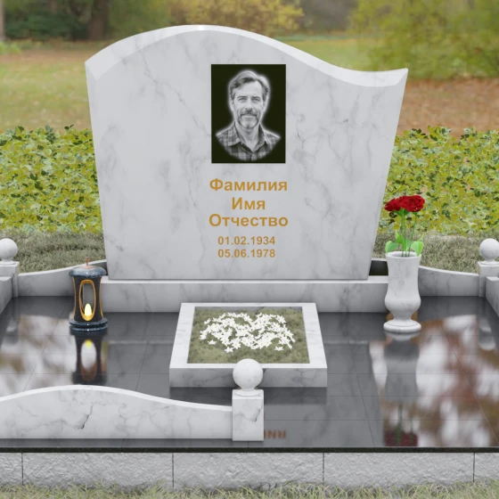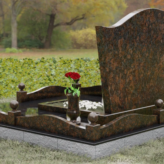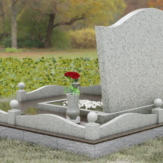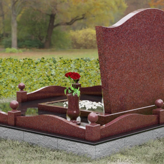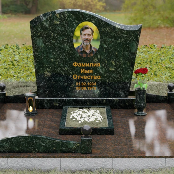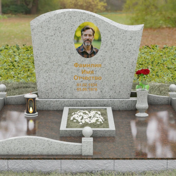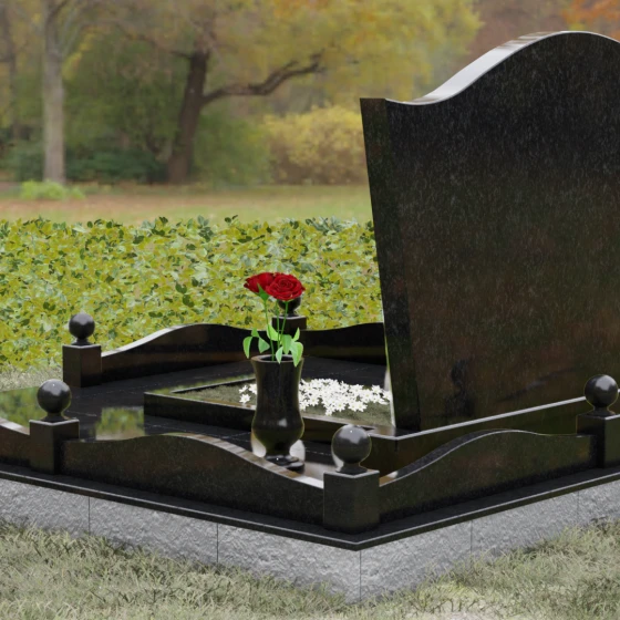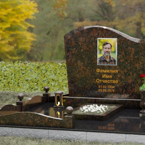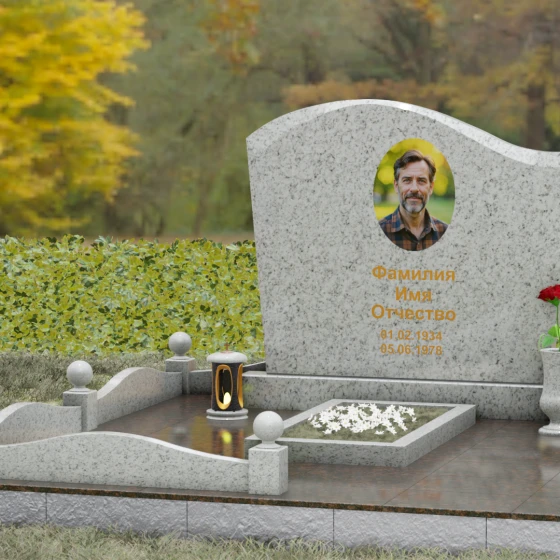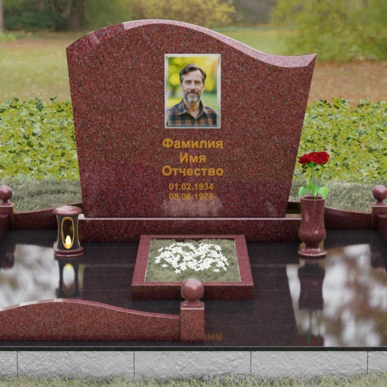 Комплектация данного решения продумана до мельчайших деталей, создавая законченное и ухоженное пространство. Стела установлена на массивное основание, которое переходит в закрытый цоколь. По периметру участка смонтирован невысокий каменный бордюр, украшенный изящными декоративными столбиками с навершиями в виде идеально отполированных шаров. Такое архитектурное решение придает мемориалу торжественный и защищенный вид. Внутренняя часть участка полностью перекрыта цельной надгробной плитой, что не только выглядит эстетично и монолитно, но и значительно упрощает благоустройство: под камнем не будет прорастать трава, а чистота сохранится в любую погоду. В состав композиции включены важные аксессуары: точеная гранитная ваза для живых цветов и закрытая лампада, предназначенная для защиты поминального огня от ветра.