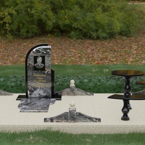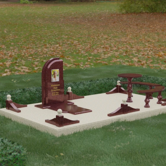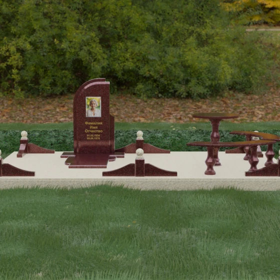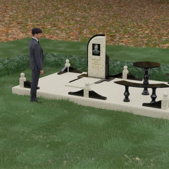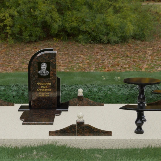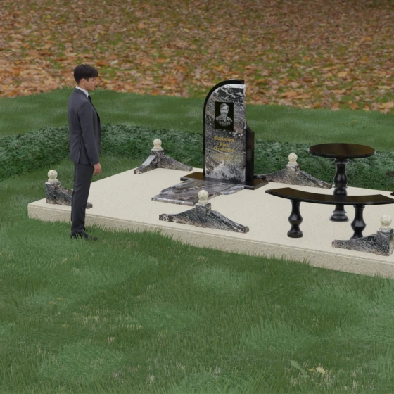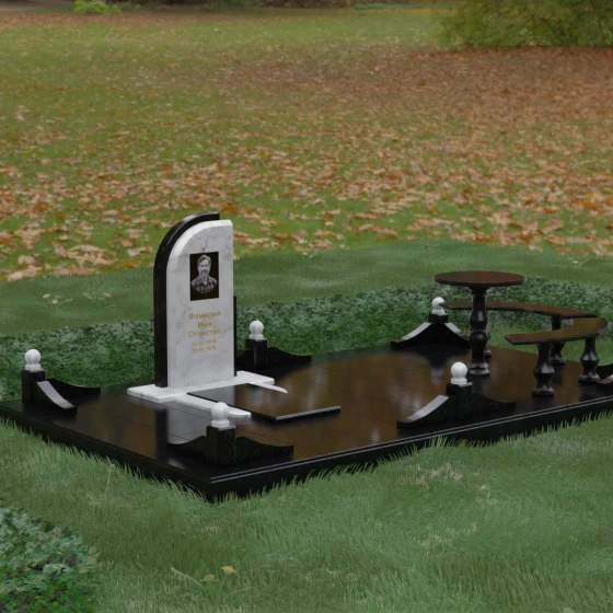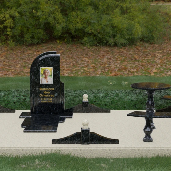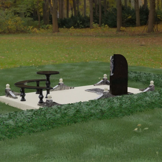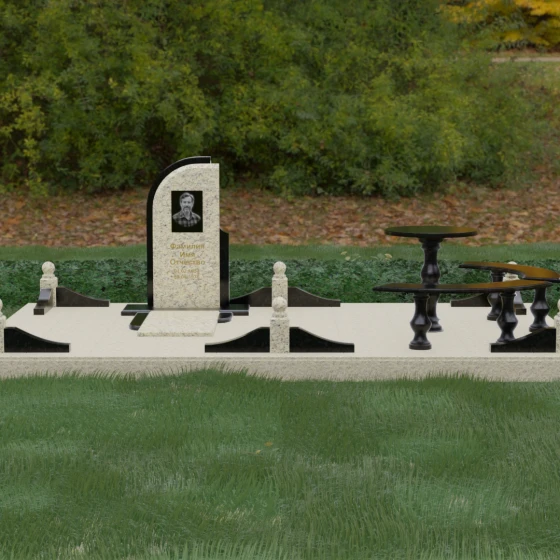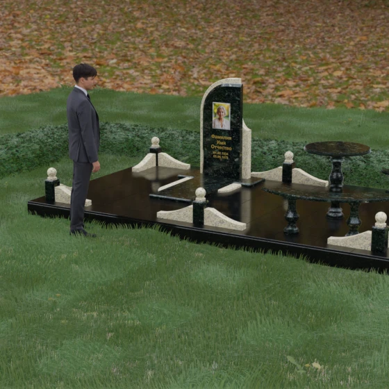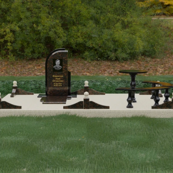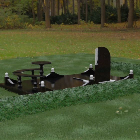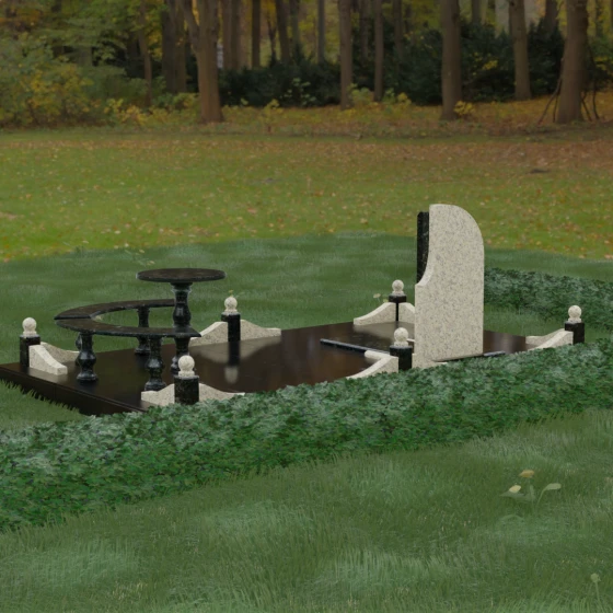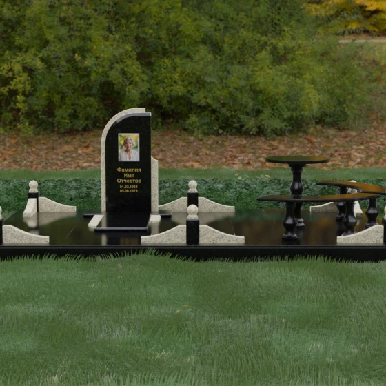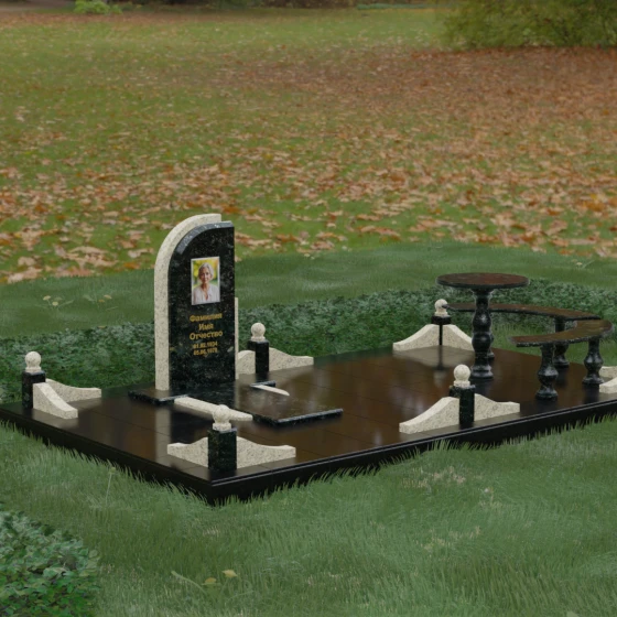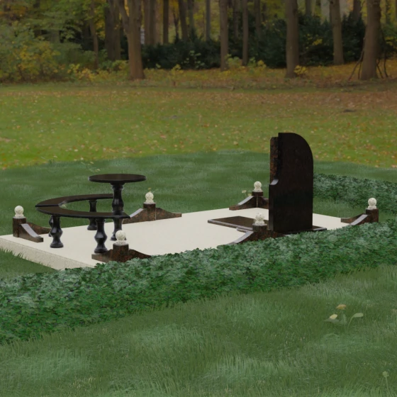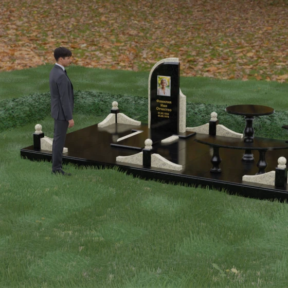 Благоустройство участка выполнено в стиле европейского мемориального дизайна, подразумевающем полное мощение площади полированными плитами. Это создает законченный, благородный вид и полностью исключает необходимость борьбы с сорняками. Периметр обозначен декоративным цоколем с оригинальными волнообразными вставками из светлого камня. Венцом ограждения служат массивные гранитные столбики, увенчанные идеально отполированными шарами — символами вечности и завершенности жизненного пути. В правую часть комплекса интегрирована зона поминовения: изящный круглый стол на фигурной балясине и полукруглая скамья, повторяющая плавные очертания общей архитектуры комплекса. Использование тех же сортов камня в мебели, что и в основной стеле, связывает все элементы в единую художественную канву.