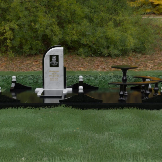 Центральным элементом композиции является величественная стела, выполненная в уникальной комбинированной технике. Конструкция состоит из двух контрастных сегментов: строгой вертикальной плиты из темного полированного камня и изящного дугообразного элемента, который словно обрамляет основную часть, создавая эффект многослойности и архитектурной защищенности. Геометрия модели построена на изысканном сочетании мягких изгибов верхней части и четких, уверенных линий основания. Особое внимание привлекает игра контрастов — зеркальная глубина темного гранита эффектно подчеркивает светлую фактуру дополнительного материала. Грани стелы обработаны с ювелирной точностью: широкие фаски снимают излишнюю строгость, позволяя лучам света мягко преломляться на углах, создавая выразительный эффект объема и визуальной легкости массивного камня.