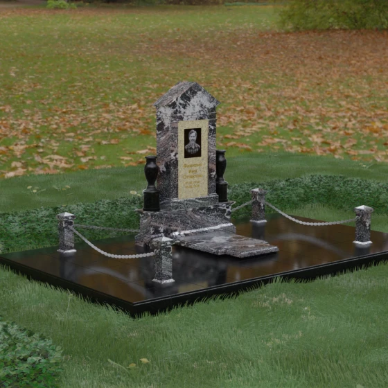 Сложная геометрия изделия подчеркивается безупречной зеркальной полировкой, в которой отражается мир, создавая ощущение глубины и пространства. Мемориальная композиция включает в себя не только основное изваяние, но и полностью благоустроенный участок. Основанием служит массивный гранитный цоколь, обеспечивающий вековую устойчивость всей конструкции. Вместо открытого грунта используется сплошная надгробная плита с идеальной фаской по периметру. Такая конфигурация не только придает захоронению завершенный, парадный вид, но и значительно упрощает уход за местом памяти, исключая появление сорняков и скопление влаги. Особое внимание уделено деталям: по углам участка установлены резные гранитные столбики с конусообразными вершинами, соединенные декоративными цепями. Этот элемент создает символическую границу, отделяющую зону вечного покоя.