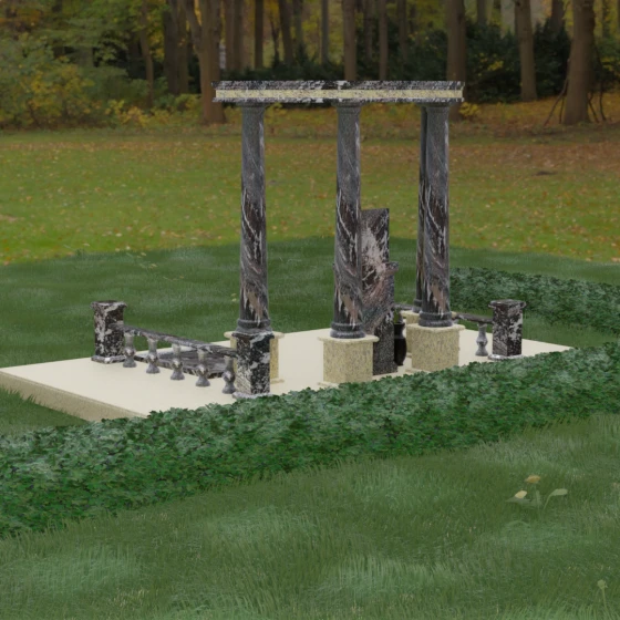 Центральным элементом композиции является величественная стела, установленная на массивный многоступенчатый постамент. Ее строгая вертикаль гармонично уравновешивается сложной архитектурной формой — классическим портиком, состоящим из четырех изящных колонн. Колонны имеют безупречную цилиндрическую форму с детально проработанными базами и капителями, которые поддерживают массивный дугообразный архитрав. Идеальная зеркальная полировка камня создает завораживающую игру отражений, подчеркивая монументальность строения.
