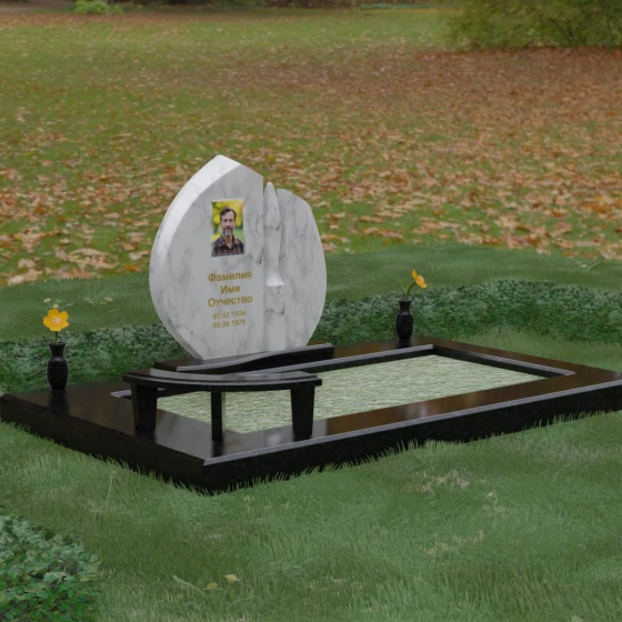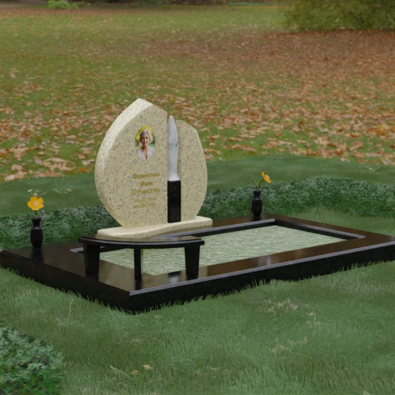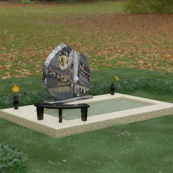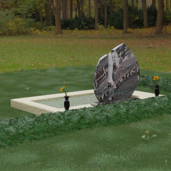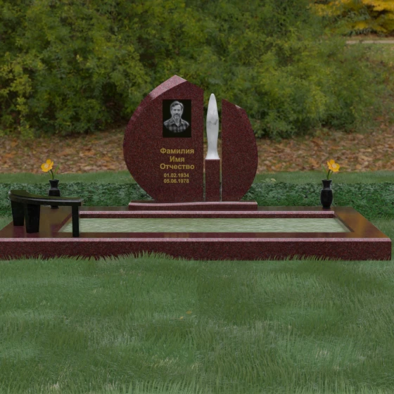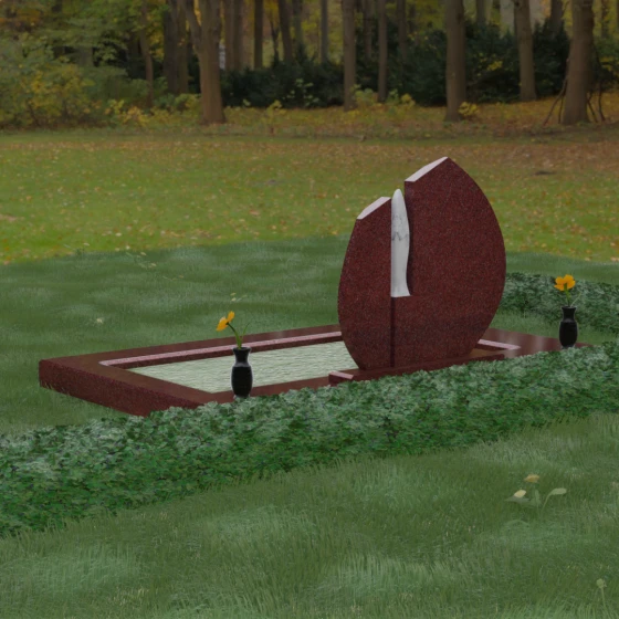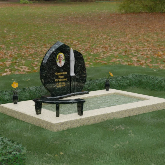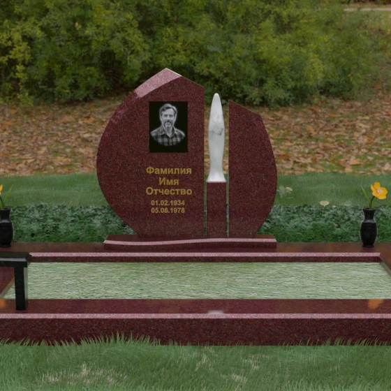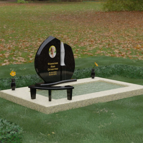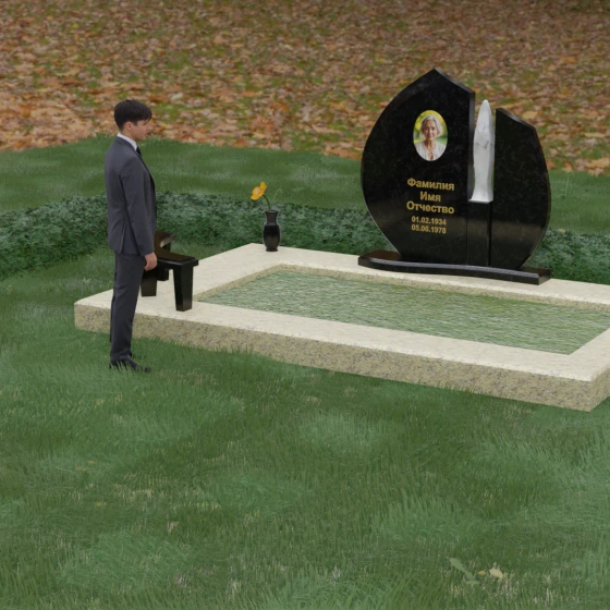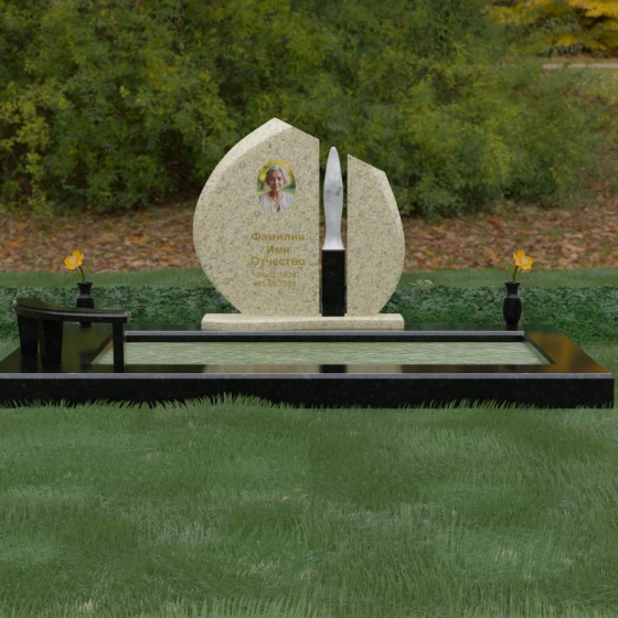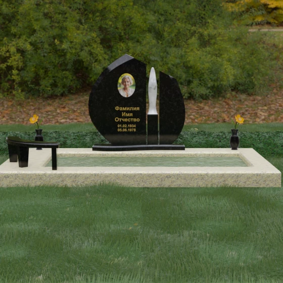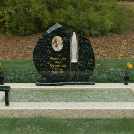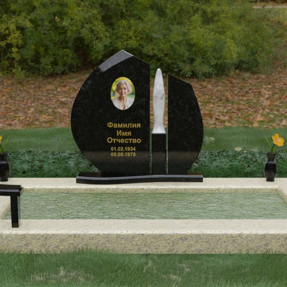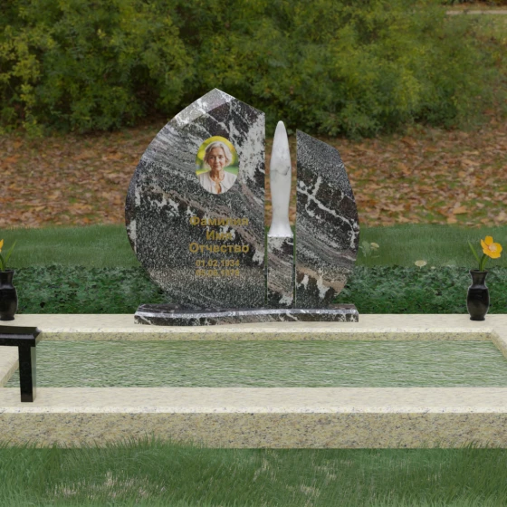 Центральное место в композиции занимает асимметричная стела, состоящая из двух контрастных по форме и цвету частей. Основной элемент выполнен в виде плавного полукруга с заостренной, напоминающей лепесток или пламя свечи, вершиной. Тщательно проработанные грани стелы имеют идеальную зеркальную полировку, в которой отражается окружающий мир, символизируя чистоту помыслов. Особое внимание привлекает центральный декоративный элемент — вертикальная вставка из белоснежного камня, выполненная в форме вытянутой капли или небесного огня. Эта деталь создает эффектный визуальный контраст с темным гранитом, разделяя композицию на «земную» и «небесную» составляющие.
