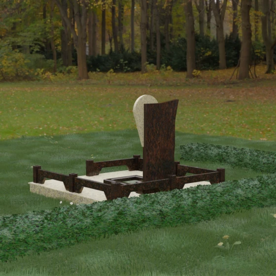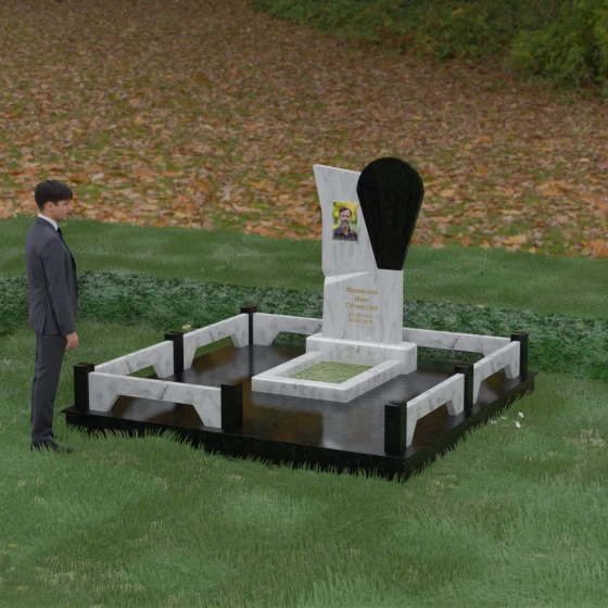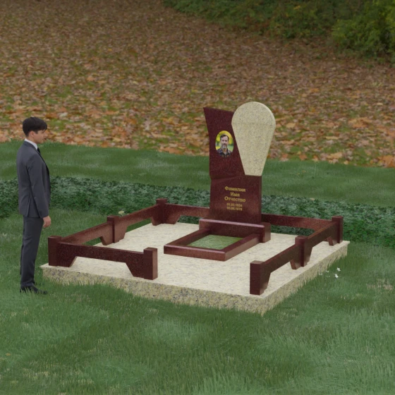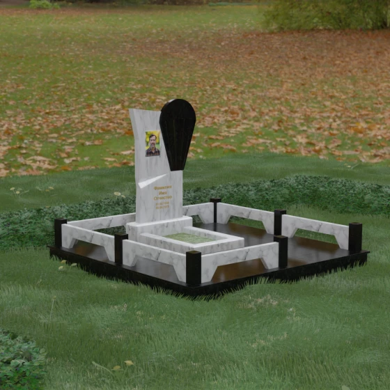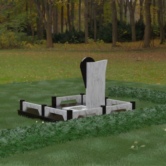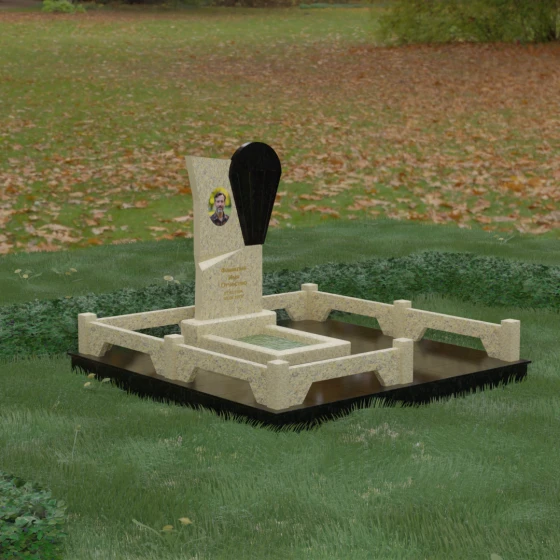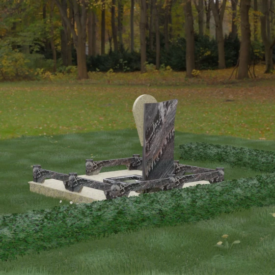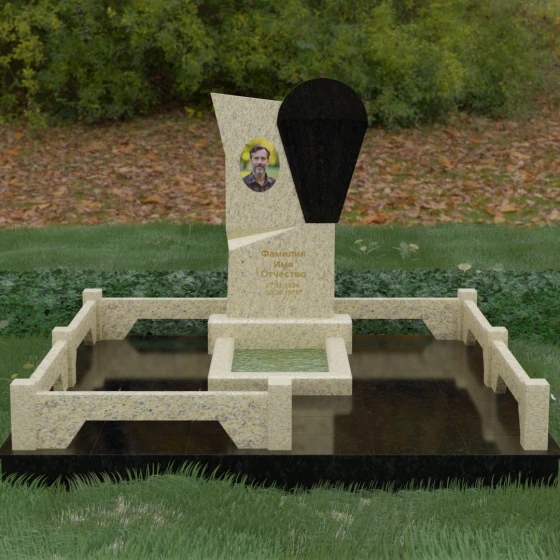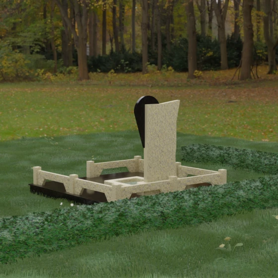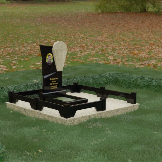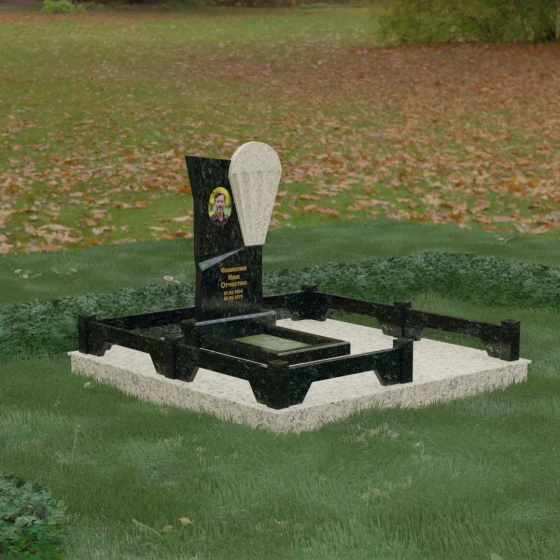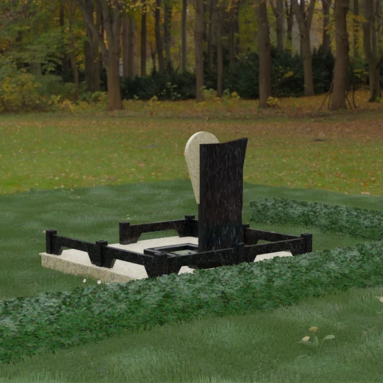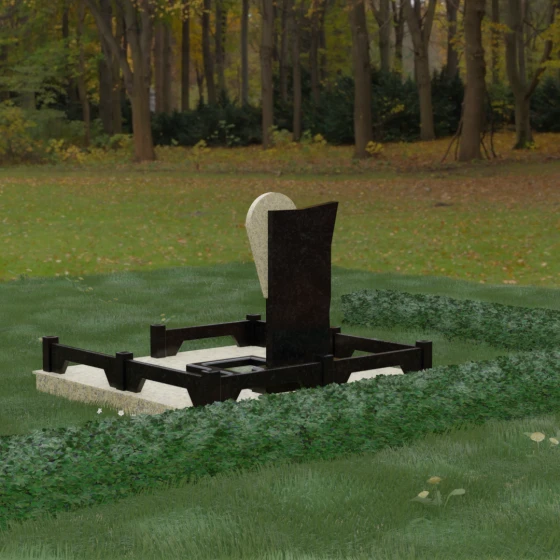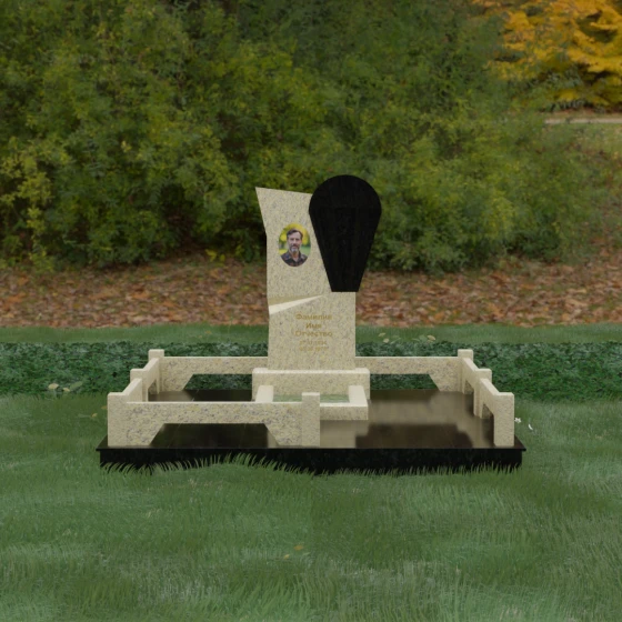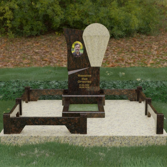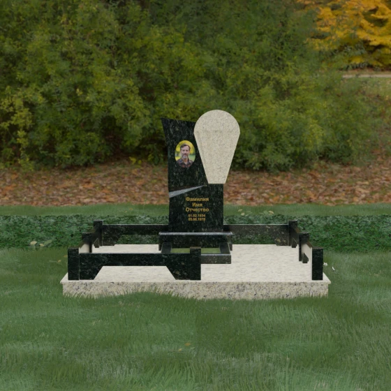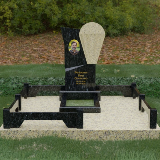 Данное ритуальное изделие представляет собой образец современной мемориальной пластики, где эстетика минимализма встречается с глубоким философским подтекстом. В центре композиции — сложная асимметричная стела, состоящая из двух контрастных элементов. Основная часть, выполненная из темного полированного камня, символизирует земную твердь и непоколебимую память, в то время как изящная светлая вставка в форме капли или воздушной сферы, устремленной вверх, олицетворяет чистоту души и её вечный полет. Игра света на зеркальных плоскостях создает динамичный объем: грани преломляют лучи, заставляя полированную поверхность «оживать» и менять глубину оттенка в зависимости от угла зрения. Этот ансамбль выбирают за его уникальную геометрию, которая выделяется на фоне классических форм, подчеркивая индивидуальность и высокий статус места захоронения.
