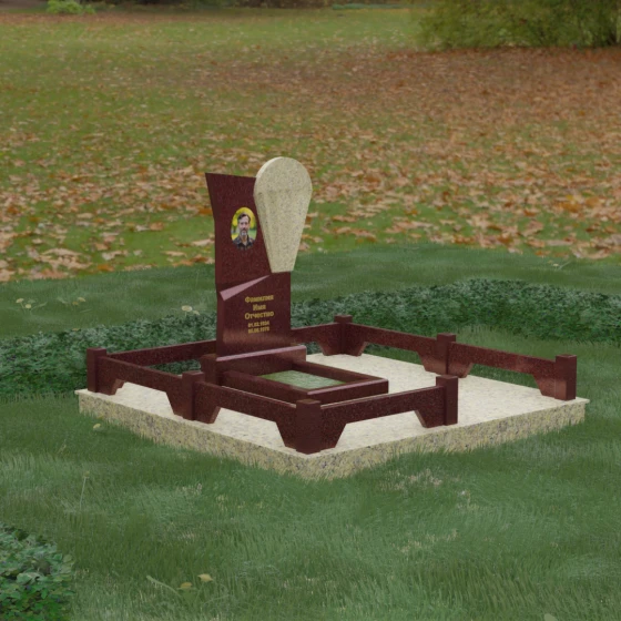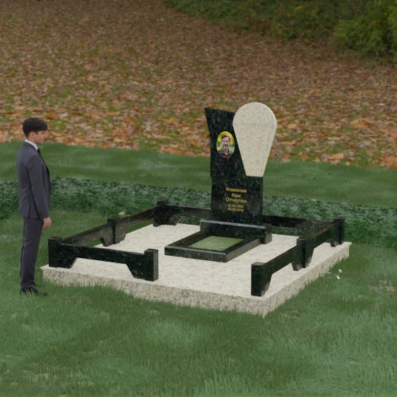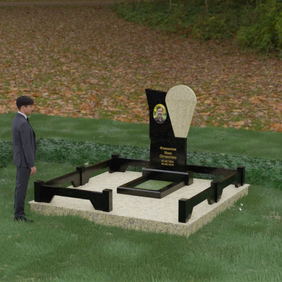 Продуманная конструкция стелы предоставляет широкие возможности для художественного оформления. Круглая ниша в темной части камня идеально подходит для размещения керамического портрета или классической гравировки, создавая эффектную рамку, которая концентрирует внимание на лице. Светлый элемент композиции служит прекрасным фоном для эпитафии, выполненной сусальным золотом или глубокой фрезеровкой — на контрастном камне буквы выглядят четко и торжественно. Особое внимание уделено благоустройству участка: территория полностью облицована плитами из натурального камня, что не только придает объекту завершенный и монументальный вид, но и практически исключает необходимость в сложном уходе, защищая почву от прорастания сорных управ. Периметр обозначен массивным открытым цоколем с акцентными столбиками, которые визуально расширяют границы участка, превращая его в единое, архитектурно выверенное пространство тишины и скорби.