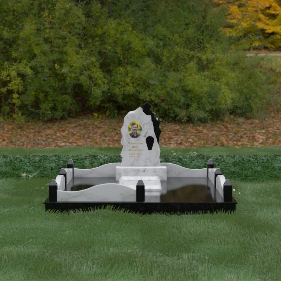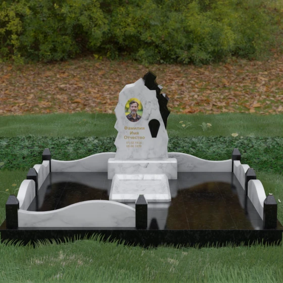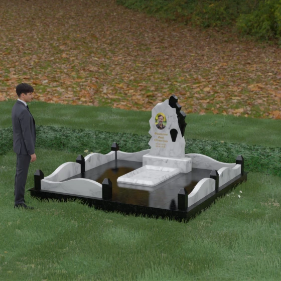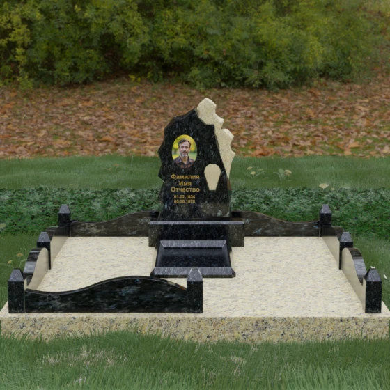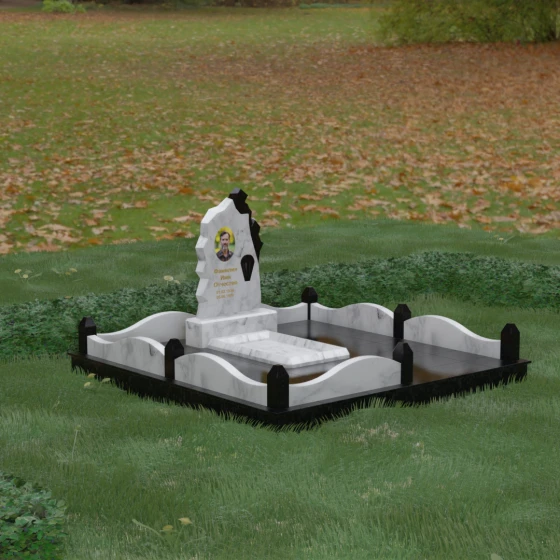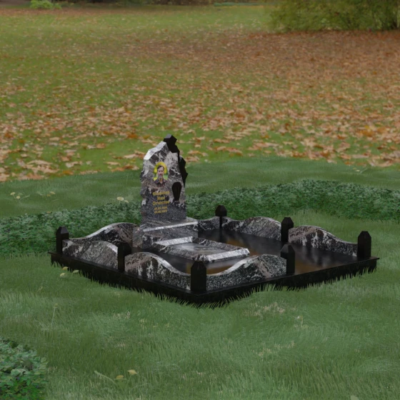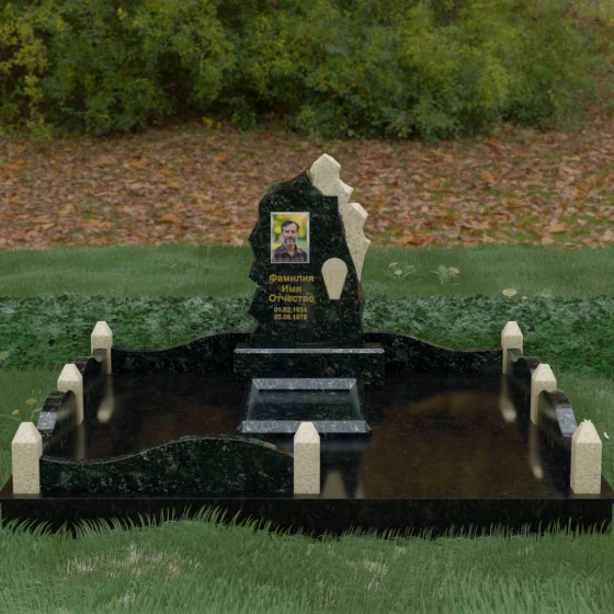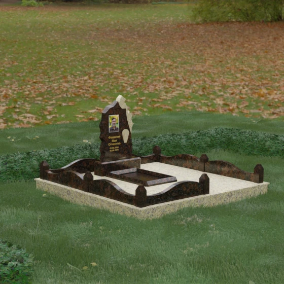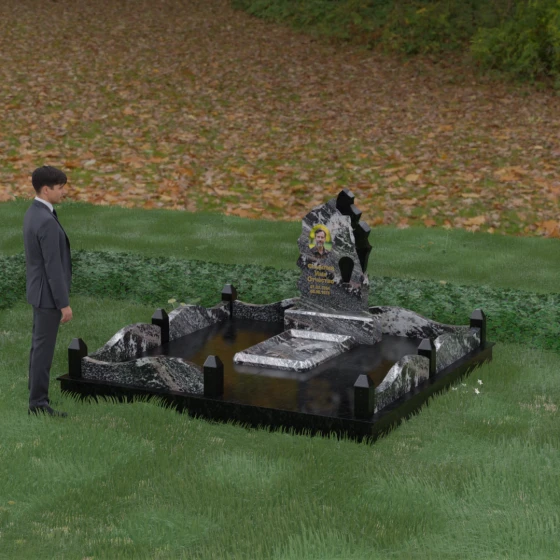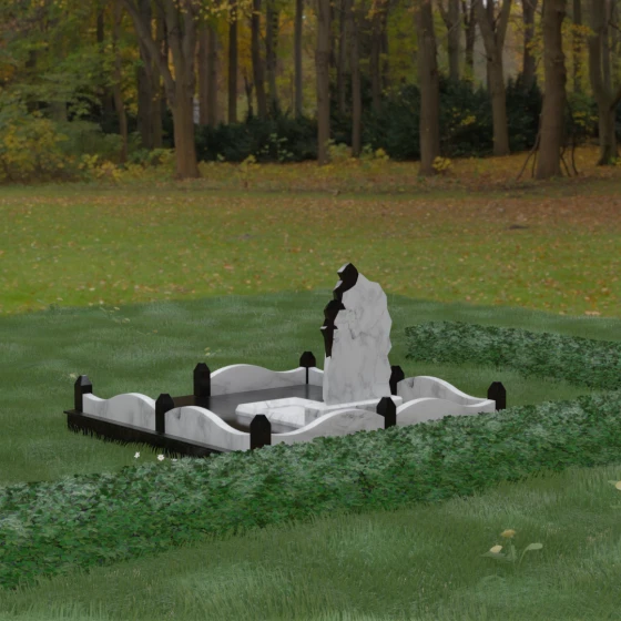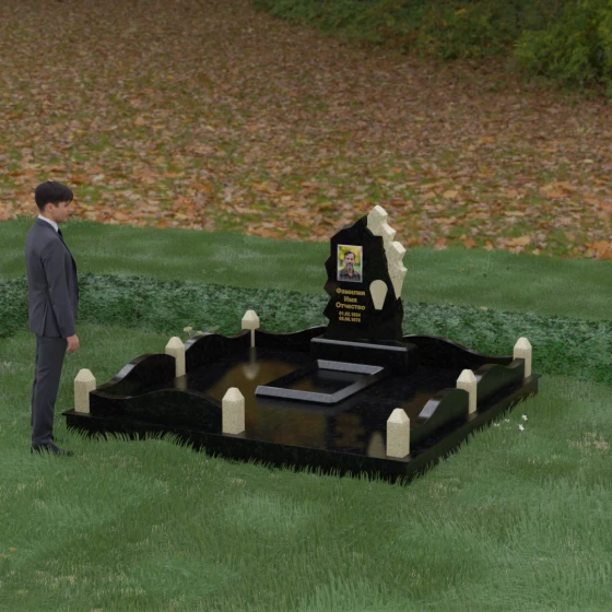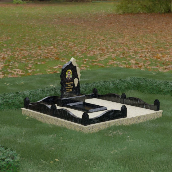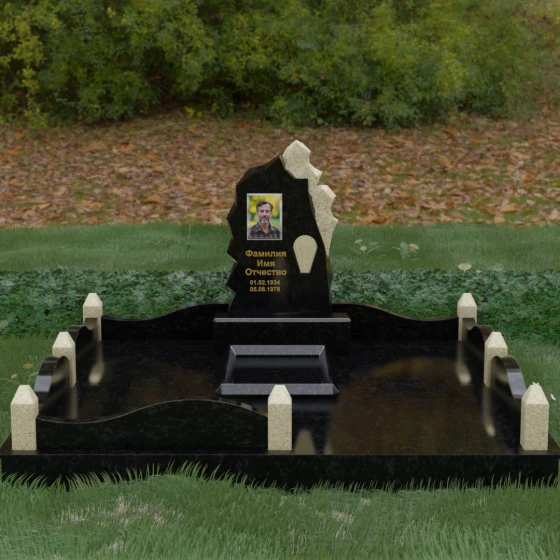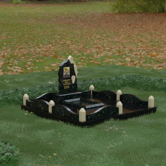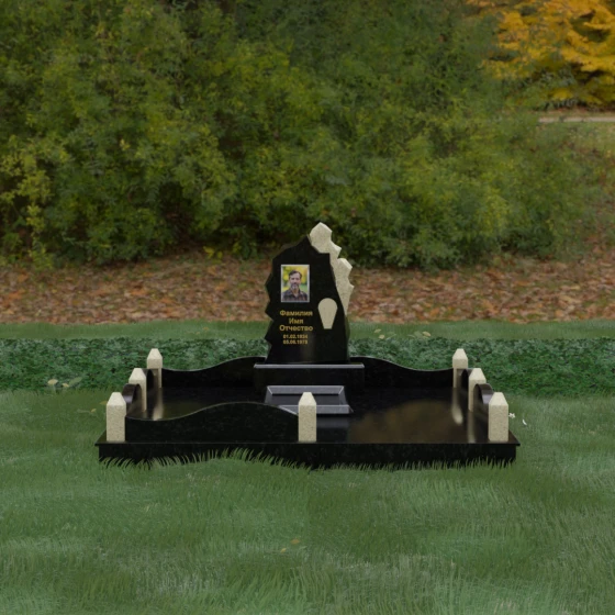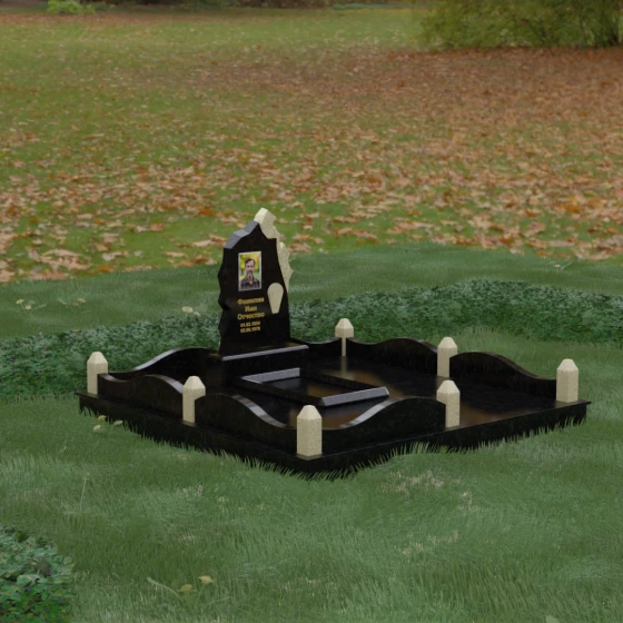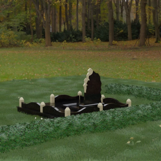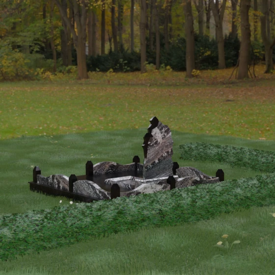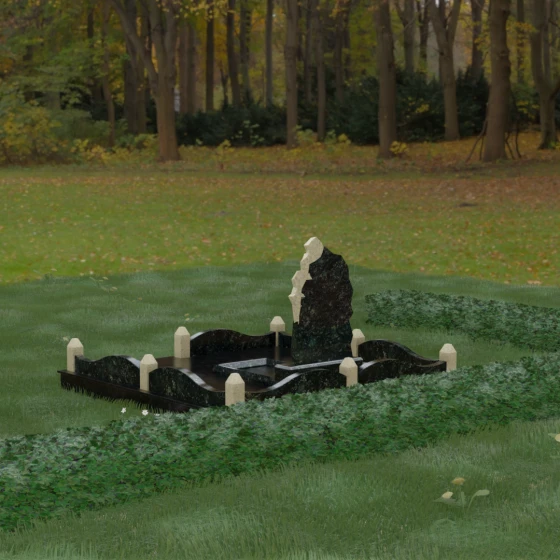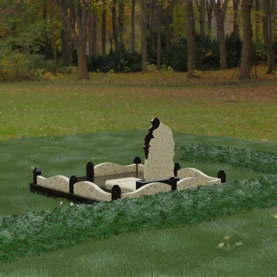 Особого внимания заслуживает художественное решение ограждения. Вместо стандартных прямых линий здесь используются плавные волнообразные изгибы боковых панелей цоколя, которые смягчают общую строгость конструкции. Периметр участка акцентирован массивными квадратными столбиками, увенчанными аккуратными пирамидальными навершиями из контрастного светлого камня. Это создает ритмический архитектурный рисунок, превращая место захоронения в обособленное, защищенное пространство, пропитанное атмосферой покоя и светлой грусти. Плавность линий в сочетании со строгими вертикальными акцентами делает этот мемориал универсальным и эстетически совершенным решением для достойного увековечивания памяти.