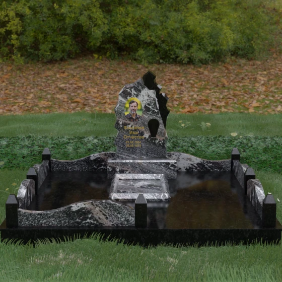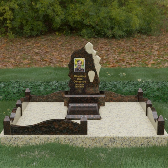 Выбор мемориального ансамбля — это всегда поиск баланса между эстетикой, долговечностью и глубоким символизмом. Данное ритуальное изделие (Артикул 178) представляет собой величественную композицию, в которой мастерски обыгран контраст между первозданной силой природы и безупречностью человеческой обработки. Главным акцентом является вертикальная стела асимметричной формы. Ее левая сторона и центральная часть доведены до зеркального блеска, в то время как правый край имитирует фактуру дикой «скалы». Этот рваный, необработанный срез камня со светлыми вкраплениями символизирует прерванный жизненный путь, остающийся в нашей памяти незыблемым и мощным, как сама горная порода.