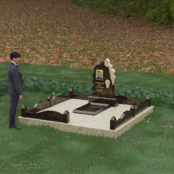 Завершает композицию продуманное благоустройство. Массивный гранитный цоколь по периметру участка служит надежным фундаментом, удерживающим всю конструкцию в едином архитектурном ключе. Светлые элементы на столбиках и резная часть стелы перекликаются друг с другом, создавая целостный визуальный ансамбль, в котором нет лишних деталей. Каждая грань, каждый изгиб этого комплекса проработаны вручную, что гарантирует эксклюзивность и высочайшее качество исполнения. Мы стремимся к тому, чтобы созданный нами памятный знак стал для вас источником утешения, воплощая в камне любовь и уважение, которые не подвластны времени.