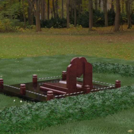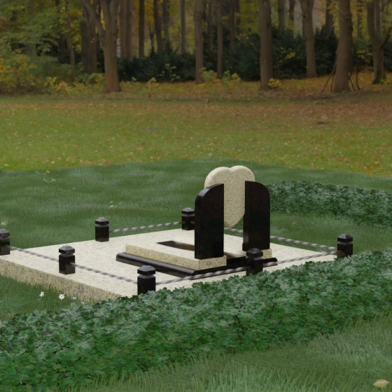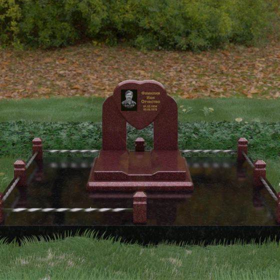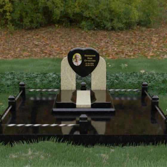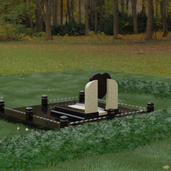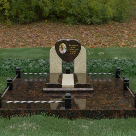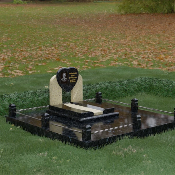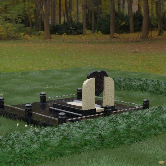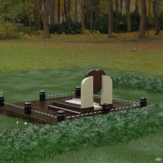 Данное ритуальное изделие представляет собой сложную архитектурную композицию, в центре которой заложена глубокая символика вечной любви и преданности. Форма сердца, изящно вписанная в обрамление из двух симметричных стел, напоминающих крылья или арку, создает ощущение защищенности и трепета. Выбор этой модели продиктован желанием выразить самые искренние чувства: плавные линии центрального элемента смягчают строгость камня, а многоуровневая структура основания придает мемориалу величественный и законченный вид. Это не просто памятный знак, а гармоничное пространство, где каждый элемент — от изгиба полированной грани до массивного цоколя — работает на создание атмосферы светлой памяти.
