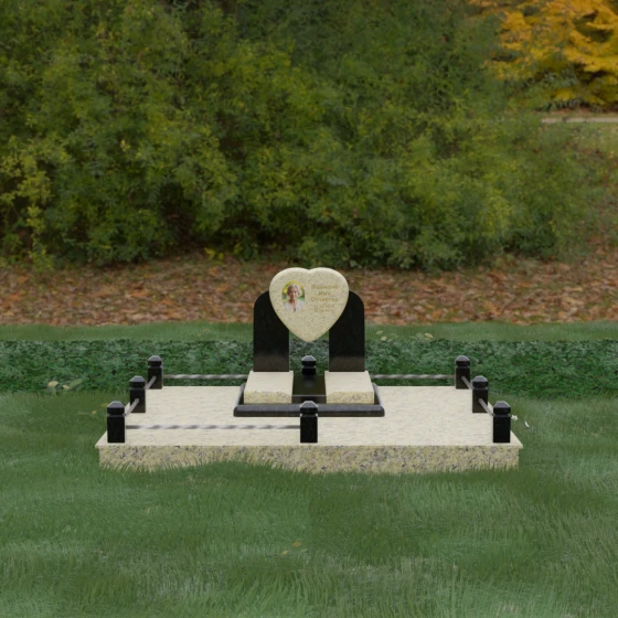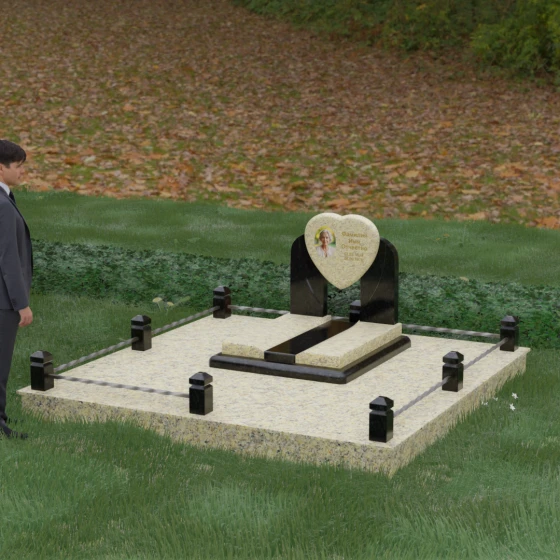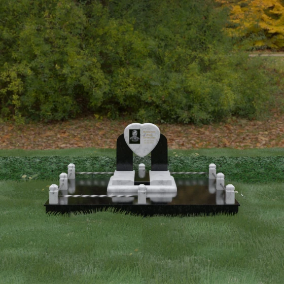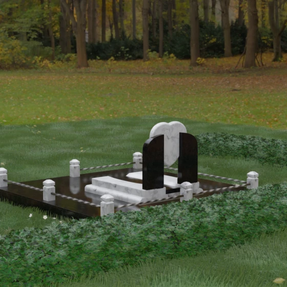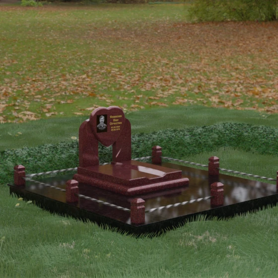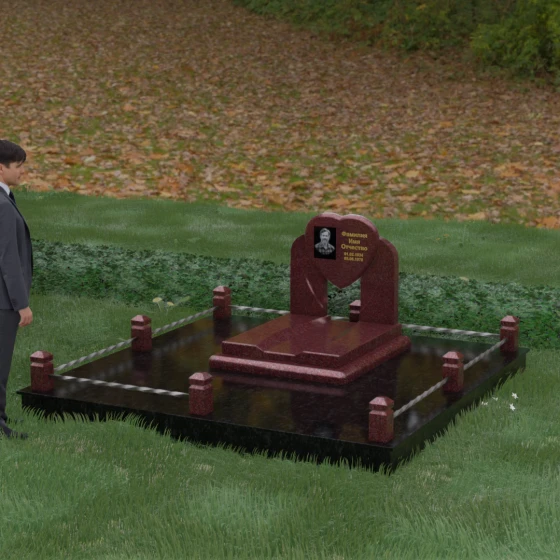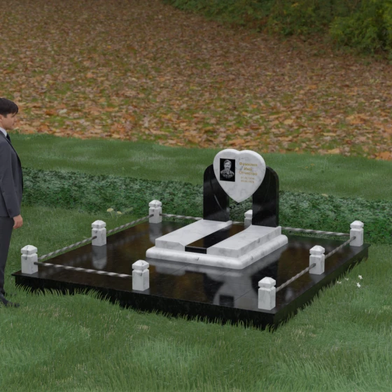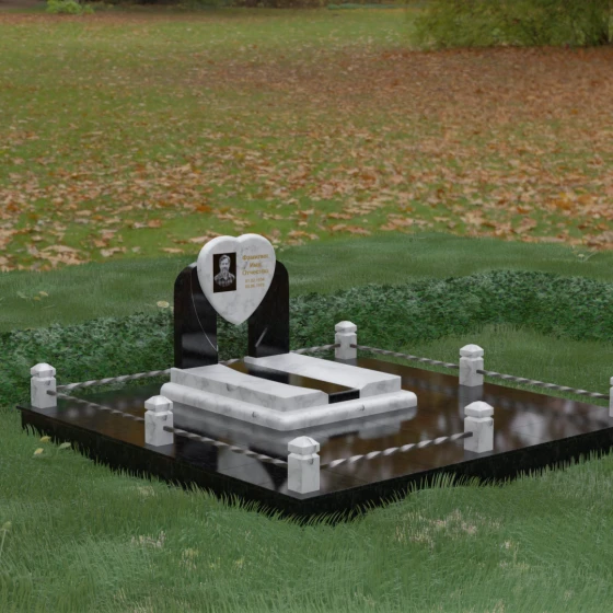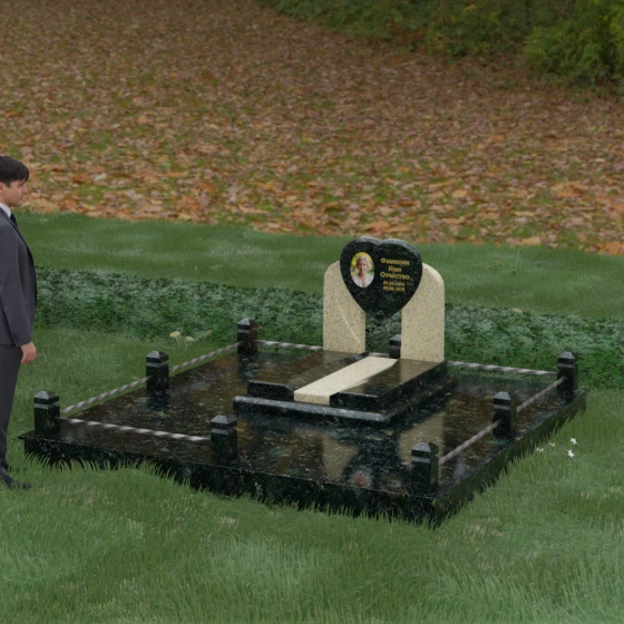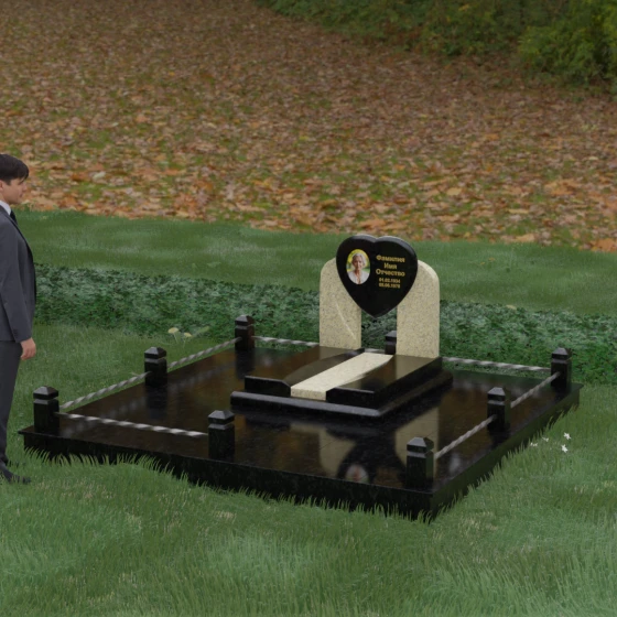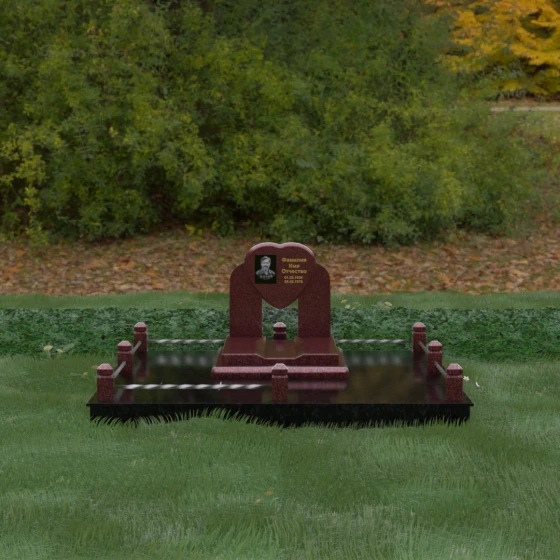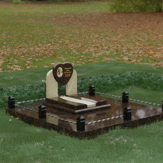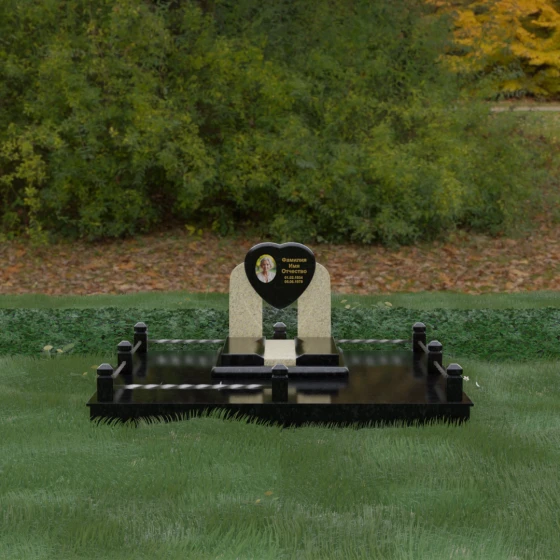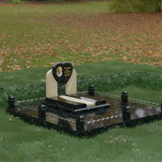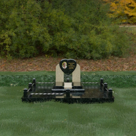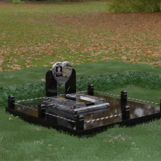 Геометрия стелы в форме сердца является идеальным местом для размещения портрета. Благодаря большой площади центральной части, здесь можно расположить как классическую гравировку, так и цветную фотокерамику, которая будет смотреться особенно эффектно на контрастном фоне. Светлые вставки в основании и на надгробной плите создают визуальную дорожку, ведущую взгляд к самому важному — лицу и имени близкого человека. Благоустройство участка продумано до мелочей: по периметру установлен массивный цоколь, облицованный плитами, что полностью исключает прорастание травы и упрощает уход за местом захоронения. Низкое ограждение, состоящее из полированных каменных столбиков с декоративной фаской и витых металлических стержней, изящно очерчивает границы, не перегружая пространство.