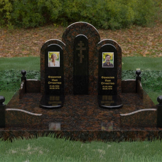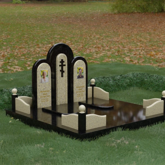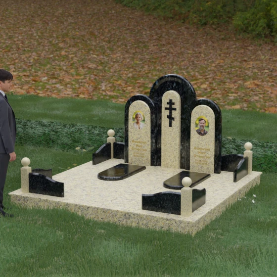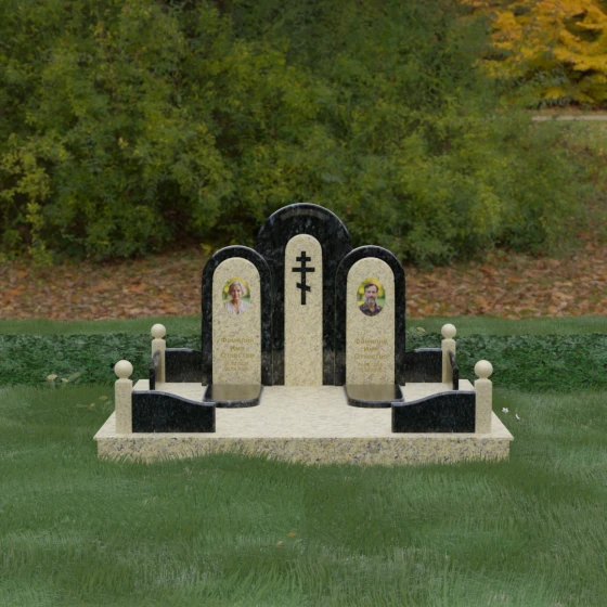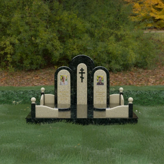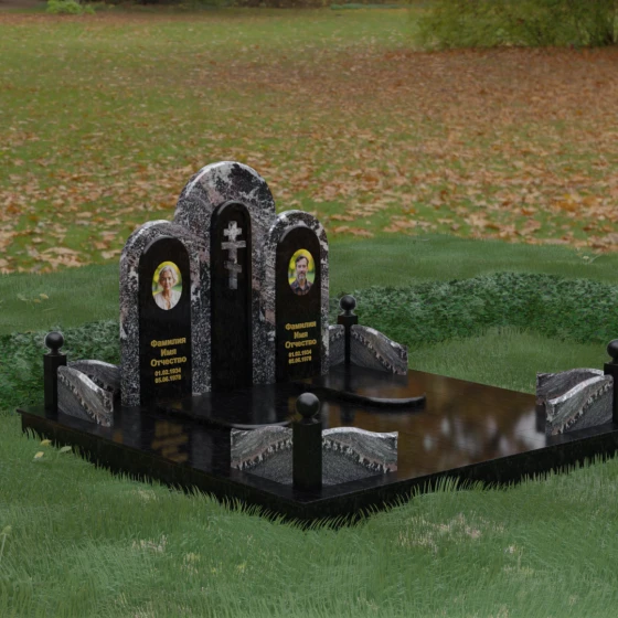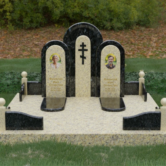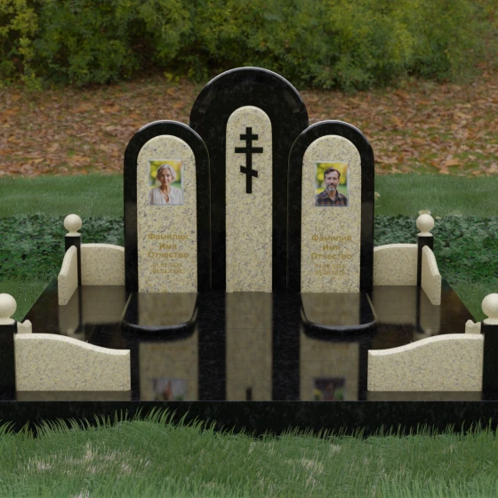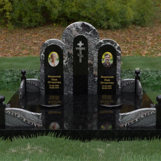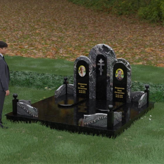Данный гранитный монумент представляет собой величественный архитектурный ансамбль, выполненный в стиле современного мемориального триптиха. В центре композиции заложена глубокая сакральная символика: три вертикальных элемента, устремленных ввысь, олицетворяют неразрывную связь душ и преемственность поколений. Центральная часть мемориала, выполненная в виде изящной арки из светлого камня, акцентирует внимание на строгом православном кресте. Лаконичность распятия подчеркивает чистоту веры и смирение, становясь духовным стержнем всей конструкции. Плавные, округлые линии наверший вызывают ассоциации с небесным сводом, даря ощущение умиротворения и вечного покоя.