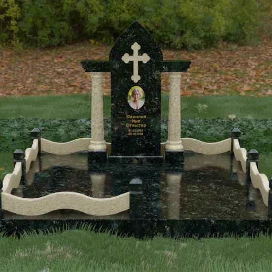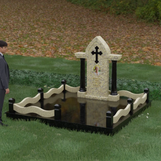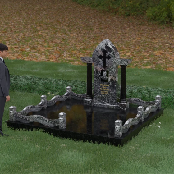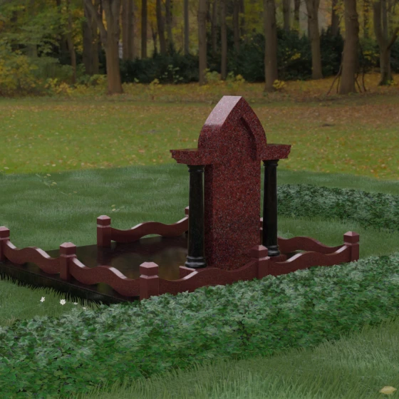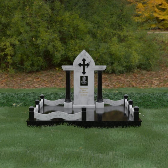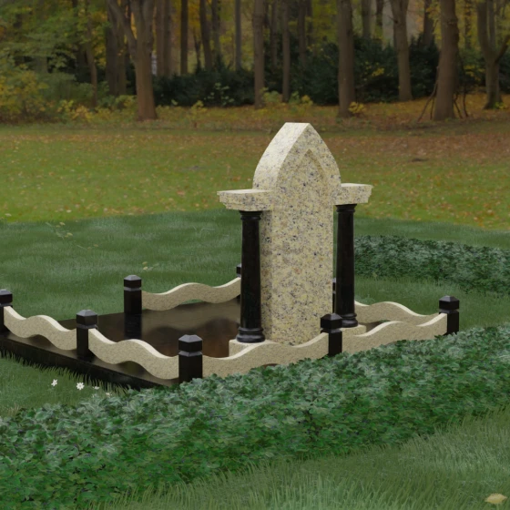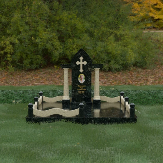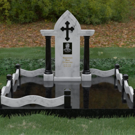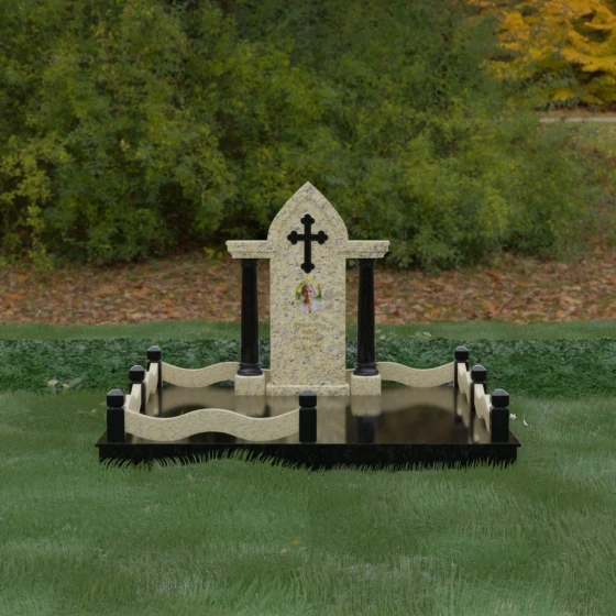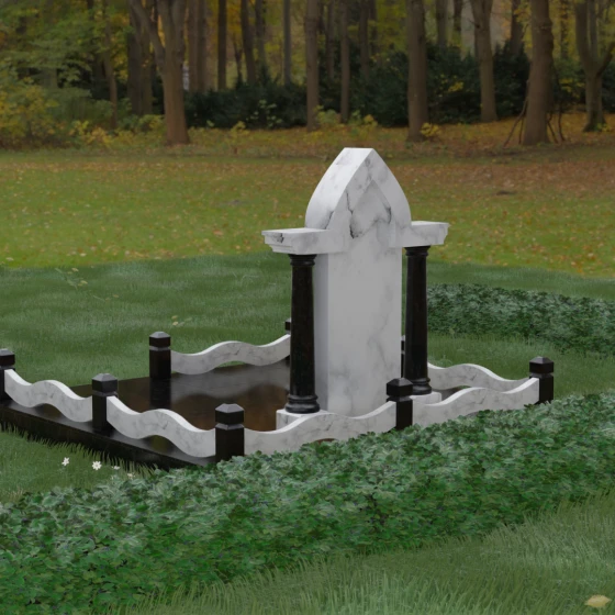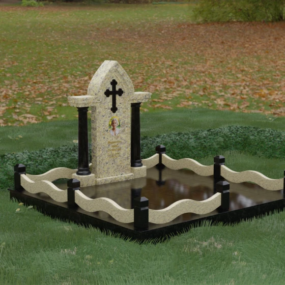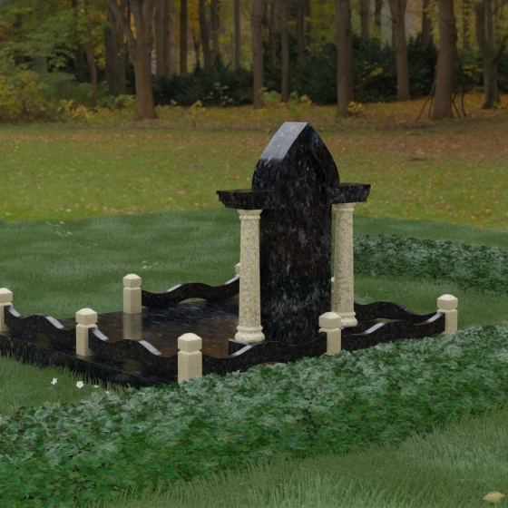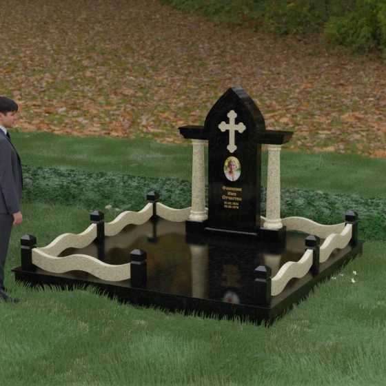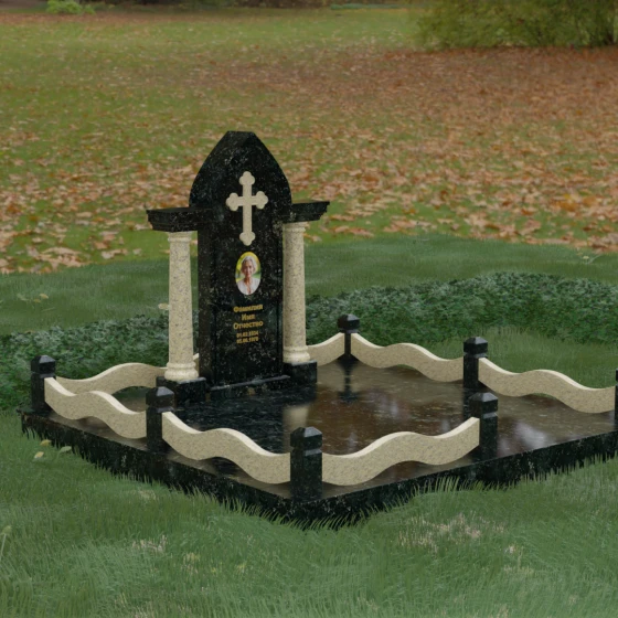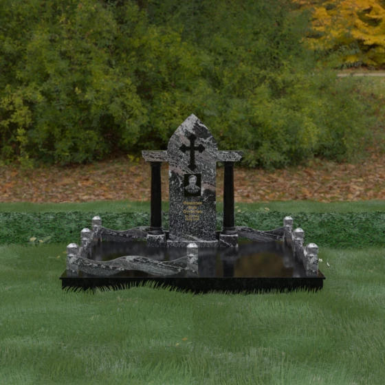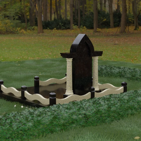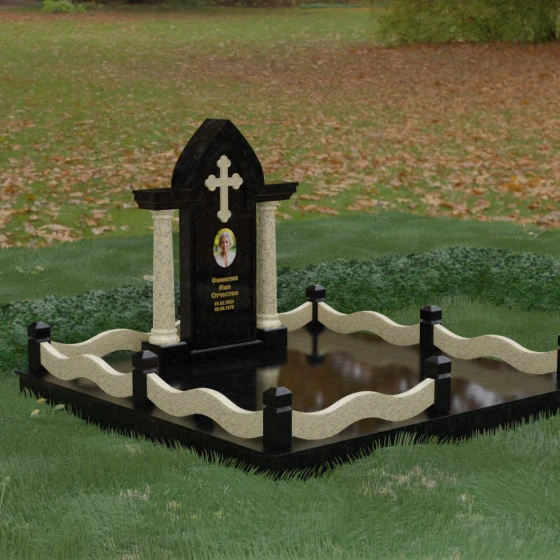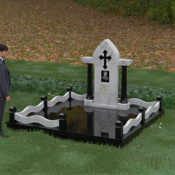 Кому подойдет: Этот мемориальный ансамбль является идеальным выбором для оформления женского захоронения — матери, супруги или дочери. Сочетание строгой формы часовни с изящными светлыми колоннами и волнообразным ограждением создает образ чистоты, любви и бесконечного уважения. Благодаря своей архитектурной сложности и возможности комбинирования цветов, данное изделие подчеркнет особый статус и значимость человека, став достойным воплощением вечной памяти в камне.